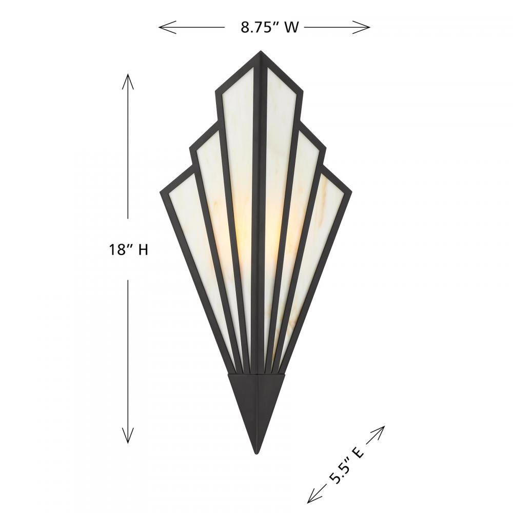 Bring a touch of Art Deco glamour to any space with the chic Savoy House Rivage 1-light sconce. Its fan-like structure is decorated with panes of beautiful Tiffany art glass and finished in Matte Black. Use it alone or in groupings for timeless allure. Rivage is 18" in height, 8.75" in width and extends 5.5" from the wall. Uses an integrated LED light source. This sconce is damp area rated.