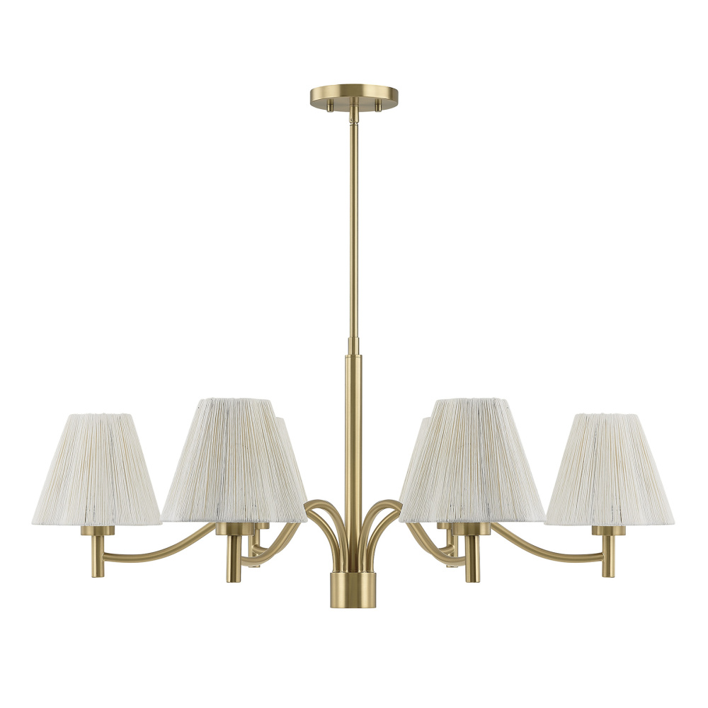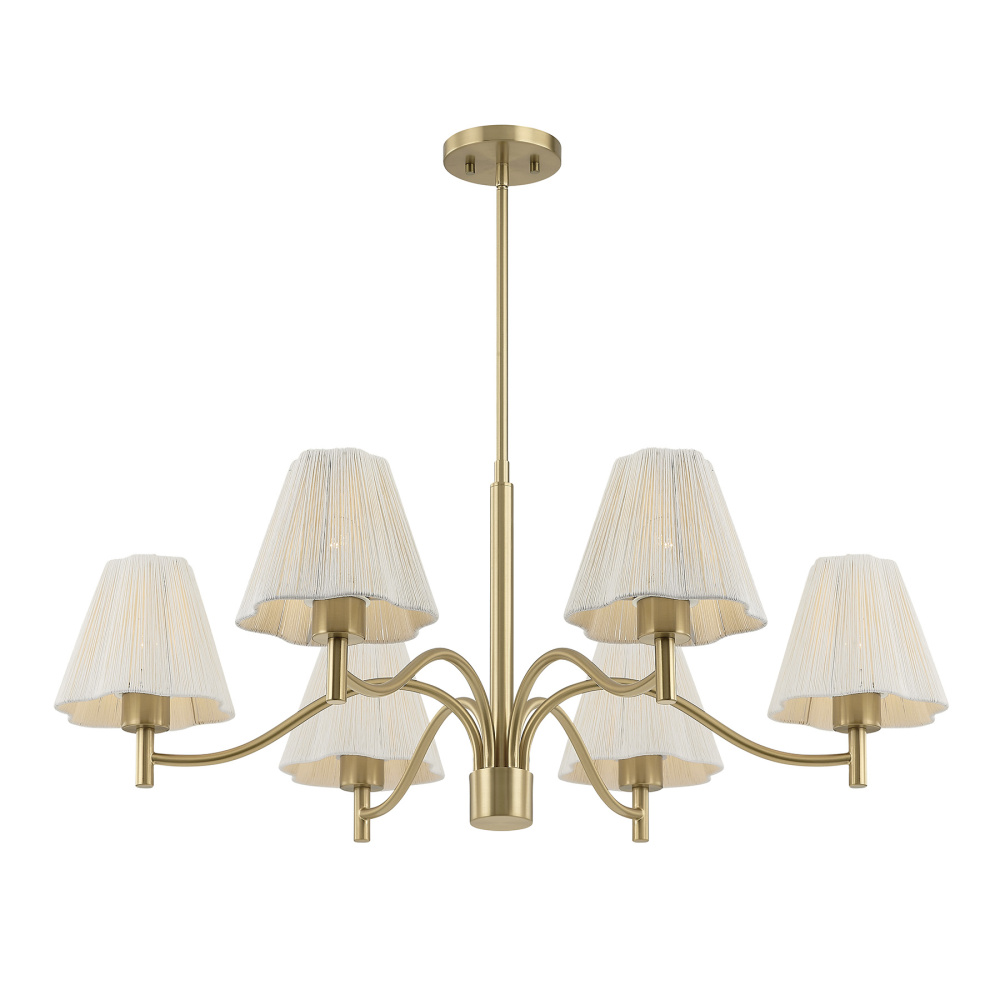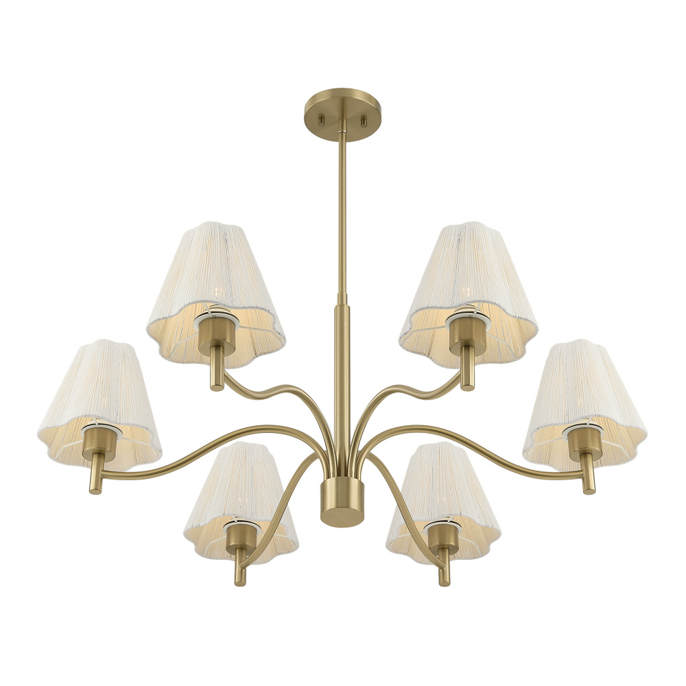 The Savoy House Rosa 6-light chandelier was designed by award-winning interior designer and TV host Breegan Jane. Inspired by the graceful geometry of a blooming rose, its scalloped white string shades radiate a soft, natural glow that fills the room with effortless serenity. A Noble Brass finish brings warmth and refinement, balancing organic texture with elevated polish. Rosa is 36" in width and has an adjustable height ranging from 15" to 69". It uses six standard size bulbs of up to 60 watts per bulb. Bulbs not included. Comes with four 12" downrods and one 6" downrod.