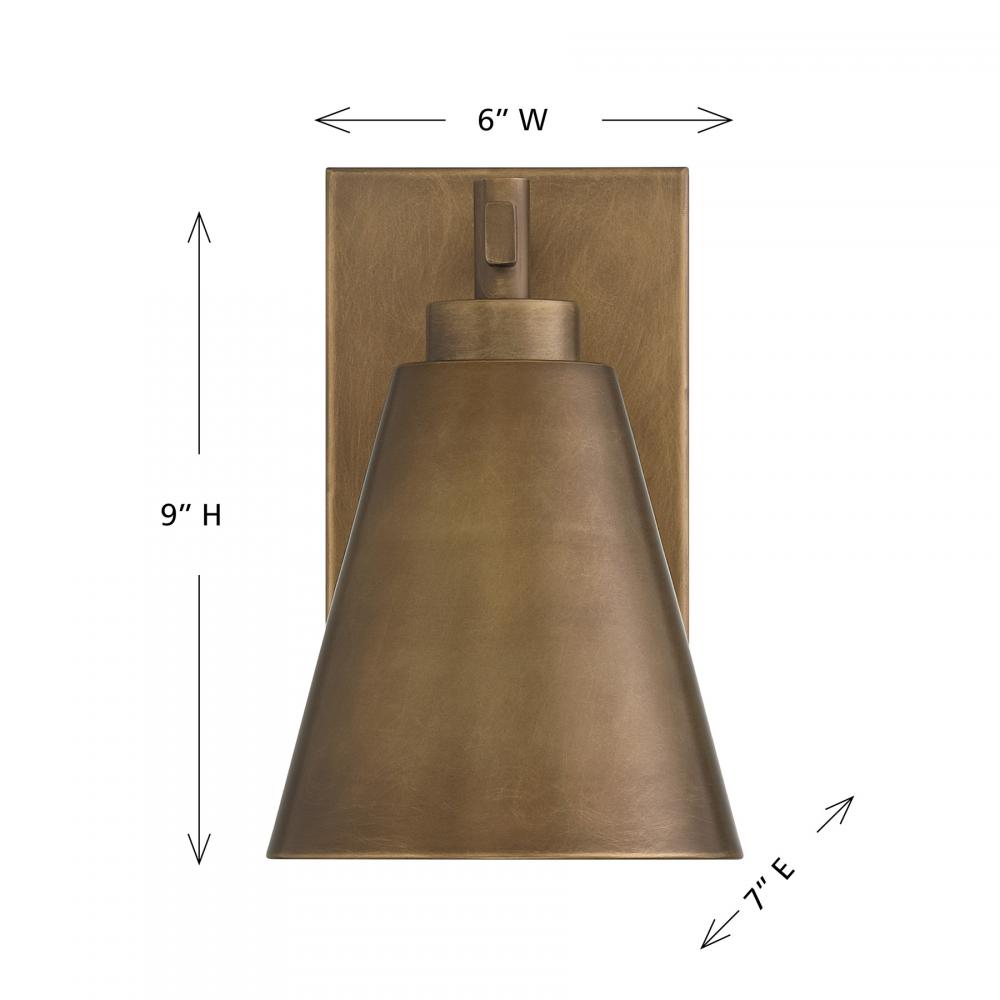 The rustic-inspired Savoy House Ryder 1-light outdoor wall sconce is a stylish light that gives off a considerate glow. Its solid metal shade is finished in Atlas Bronze and has a design that reduces light pollution through concentration and direction, making it Dark Sky friendly. Ryder is 9" in height, 6" in width and extends 7" from the wall. Uses one standard size bulb of up to 60 watts. Bulb not included. Ryder is wet area rated for use in covered or uncovered outdoor areas.