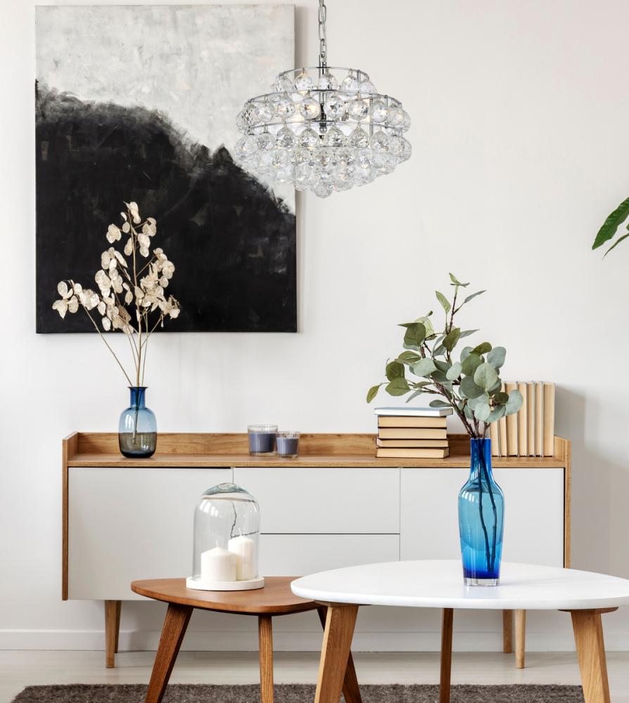 Tiers of clear multi-faceted crystals reflect the soft glow of candelabra bulbs