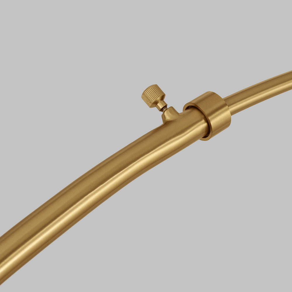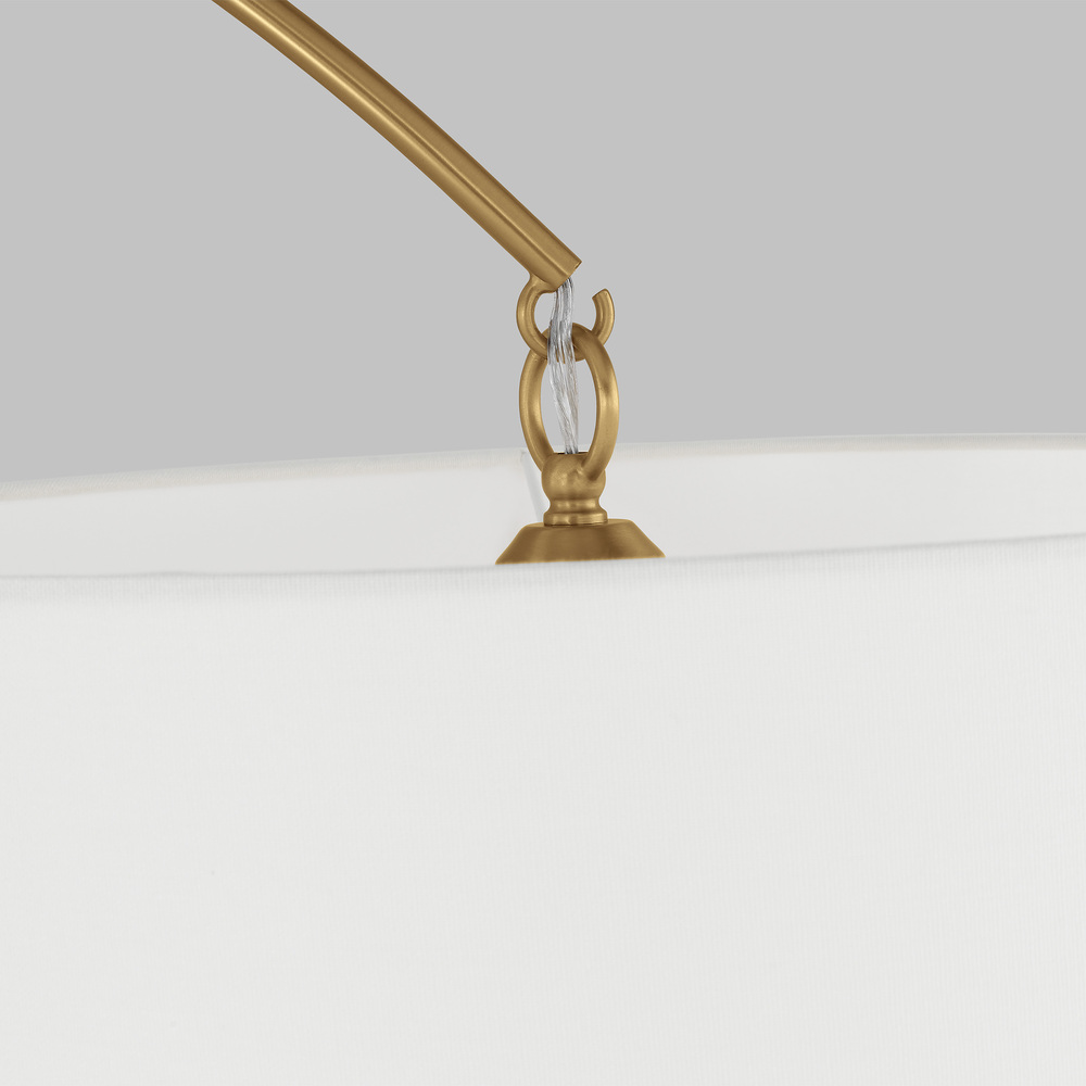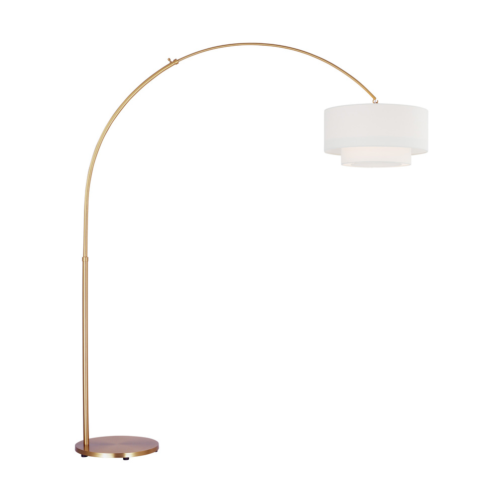 The Sawyer floor lamp in burnished brass by kate spade New York is inspired by whimsical geometry and playful lines. Sawyer has a striking silhouette with graphically taped shades. This is a classic modern arch floor lamp form dressed up with graphically taped double tiered wide shades. Use this fixture in any classic arch floor lamp scenario—a statement over a sofa or dining nook.
