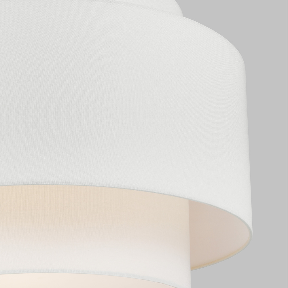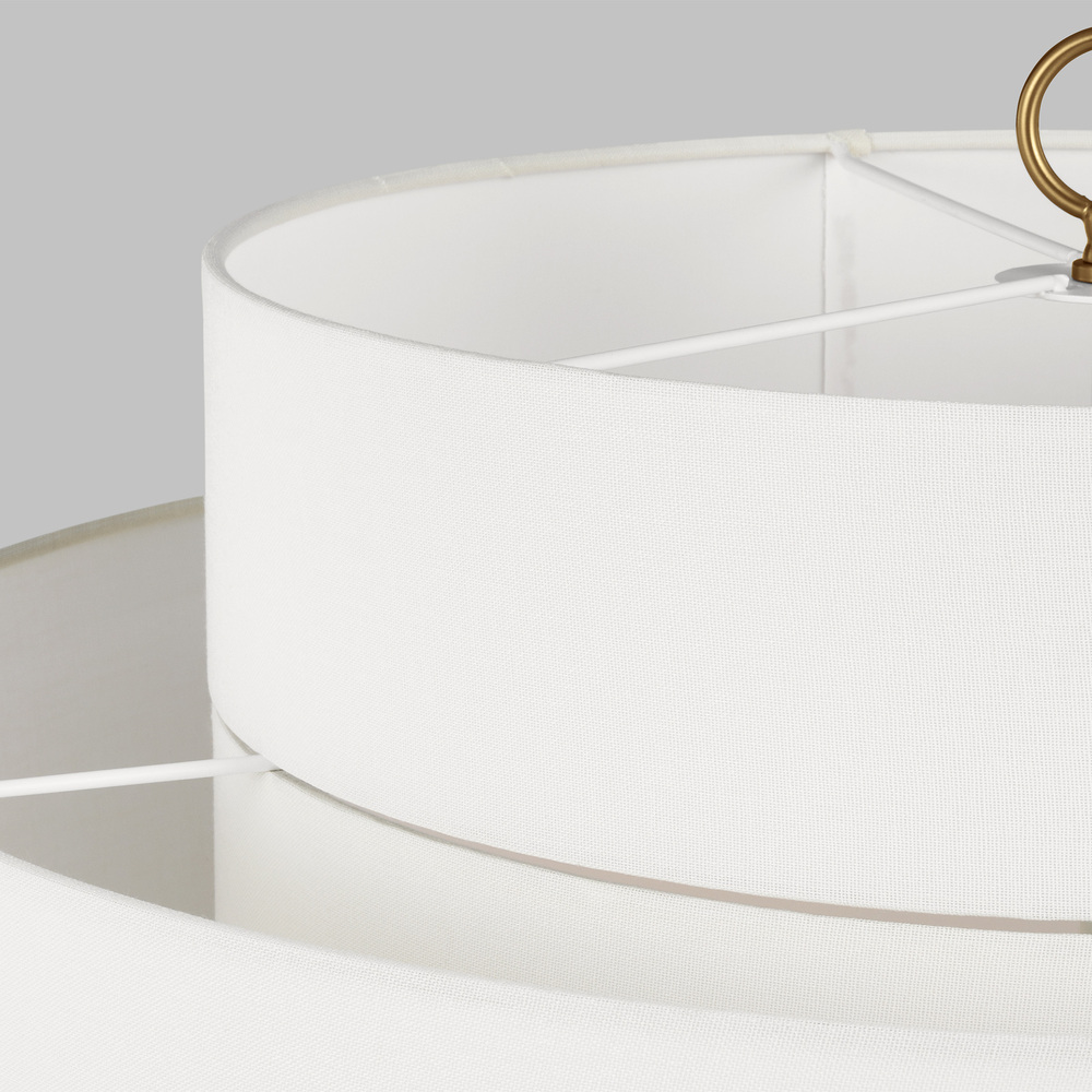 The Sawyer pendant in burnished brass is inspired by kate spade whimsical geometry and playful lines, Sawyer has a striking silhouette with graphically taped shades. A wide double tiered pendant shade with graphically taped shades. Great over a dining table or nook, or in multiples over an island.
