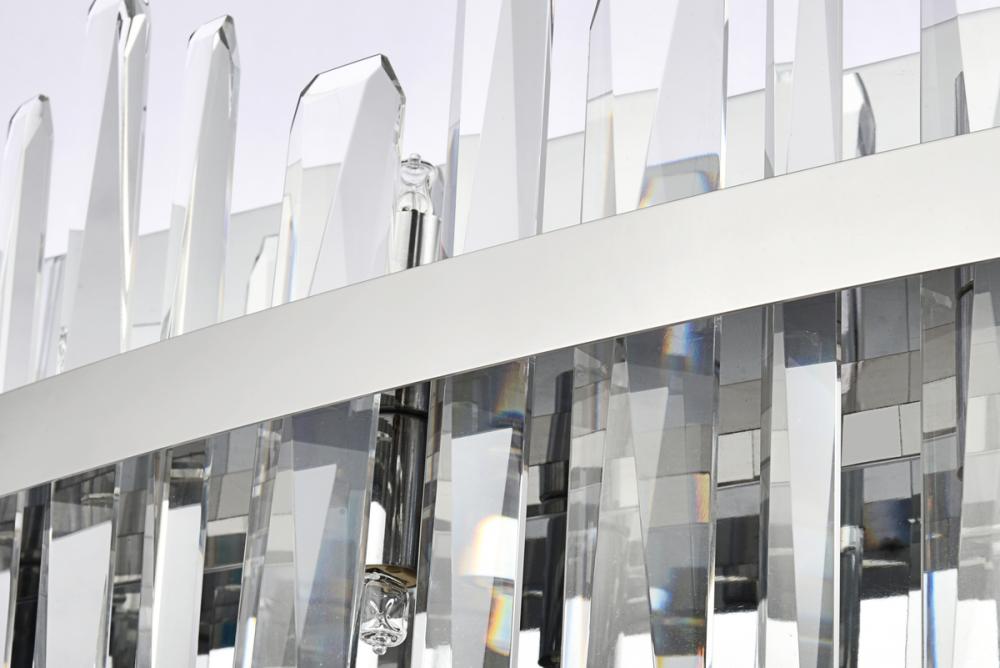 Modern crystal wall sconce features top and bottom tier crystal prisms staggered along a wrought iron frame. The thick metal frame wraps around top grade crystal prisms ensure it is built to last, definitely worth it. Mount this work of art and dim the lights for a bit of sophisticated lighting in your home. Get lost in a beautiful light and sleek design available in multiple finishes.
