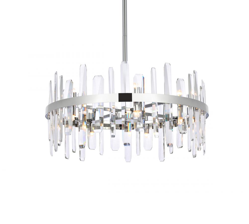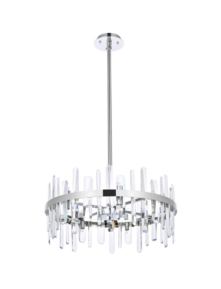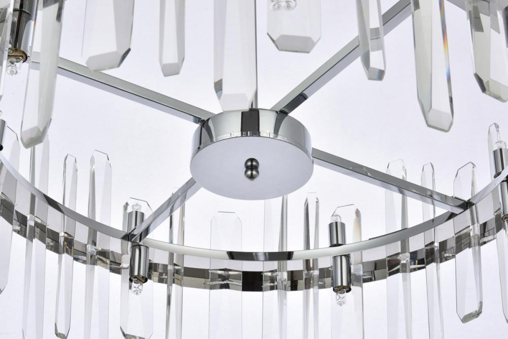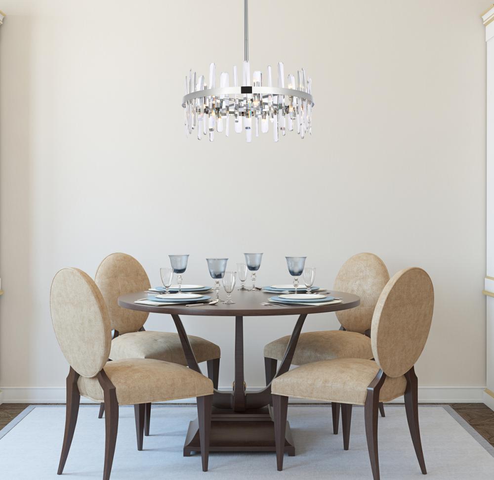 Modern crystal chandelier features top and bottom tier crystal prisms staggered along the wrought iron frame. The thick metal frame wraps around top grade crystal prisms ensure it is built to last, definitely worth it. Hang this work of art and dim the lights for a bit of sophisticated lighting in your home. Get lost in a beautiful light and sleek design available in multiple finishes. The hanging rod conveniently comes with a slope ceiling adapter, perfect for your vaulted or angled ceiling.