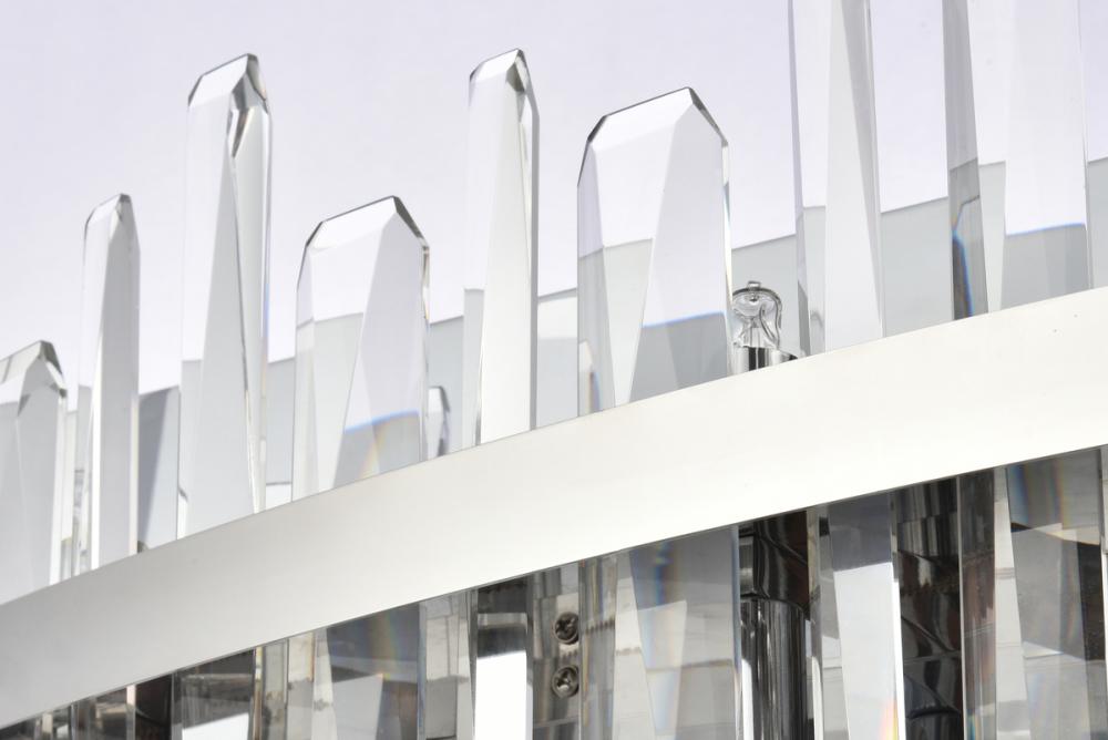 Modern crystal wall sconce features top and bottom tier crystal prisms staggered along a wrought iron frame. The thick metal frame wraps around top grade crystal prisms ensure it is built to last, definitely worth it. Mount this work of art and dim the lights for a bit of sophisticated lighting in your home. Get lost in a beautiful light and sleek design available in multiple finishes.