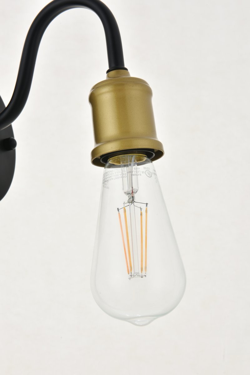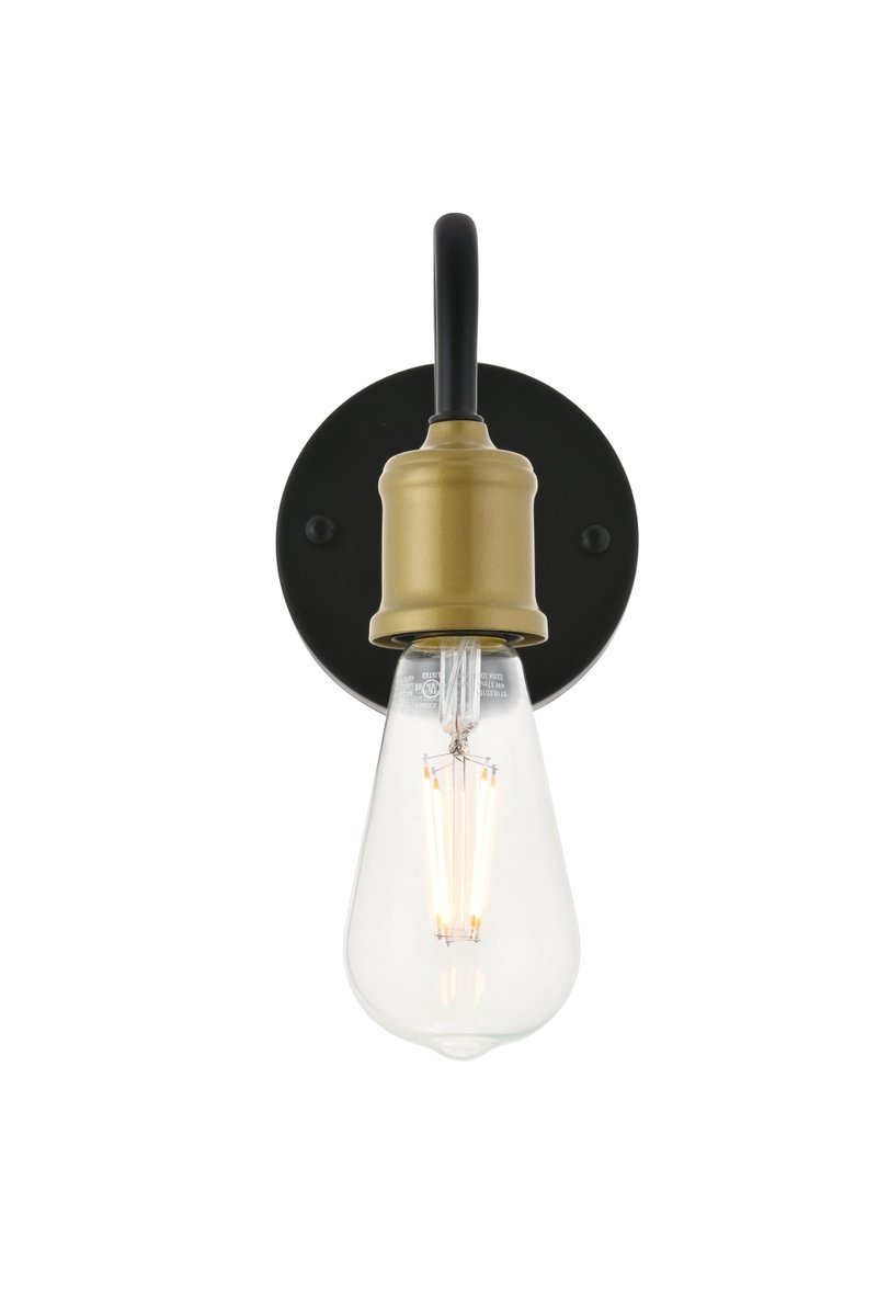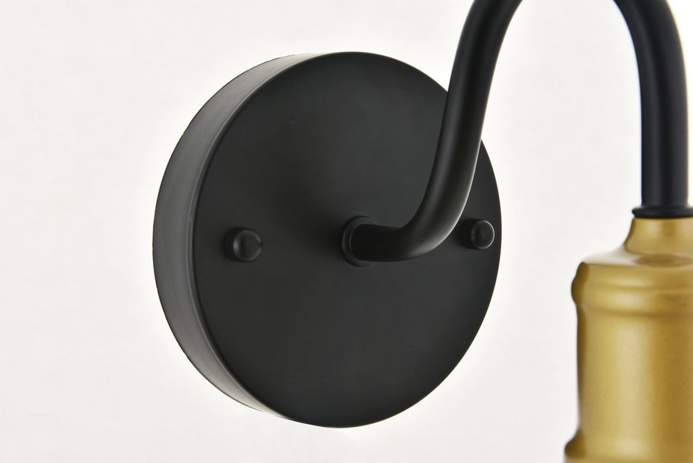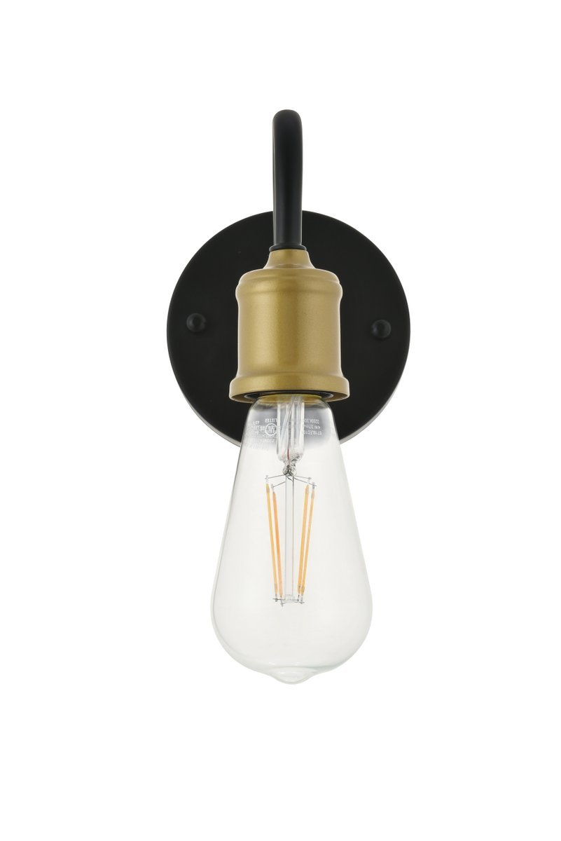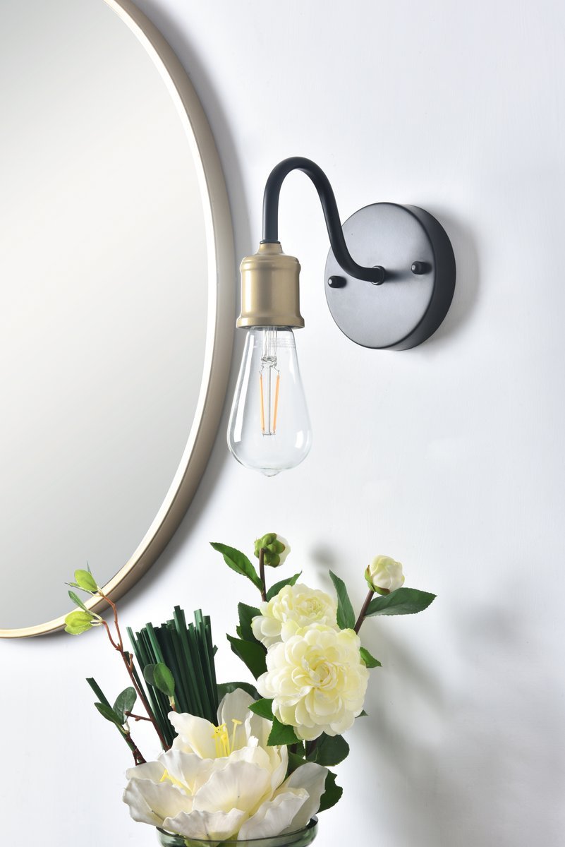 Two-toned brass and black finish wall sconce with an undulating arm and circular back plate