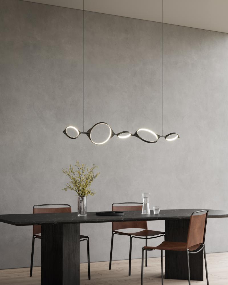 The Serif Collection features clean, angular geometrics colliding in harmony. Minimal yet impactful, the rings of light seem to float organically in air. Each piece of the Serif Collection is adjustable to fit your style, from minimal and clean uniform rings, to free-form. This versatility makes it the perfect mixture of both two- and three-dimensional art depending on the ring formations you create.