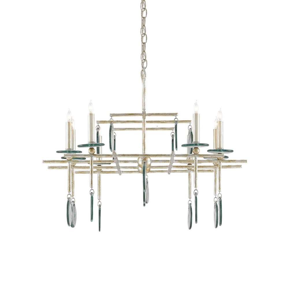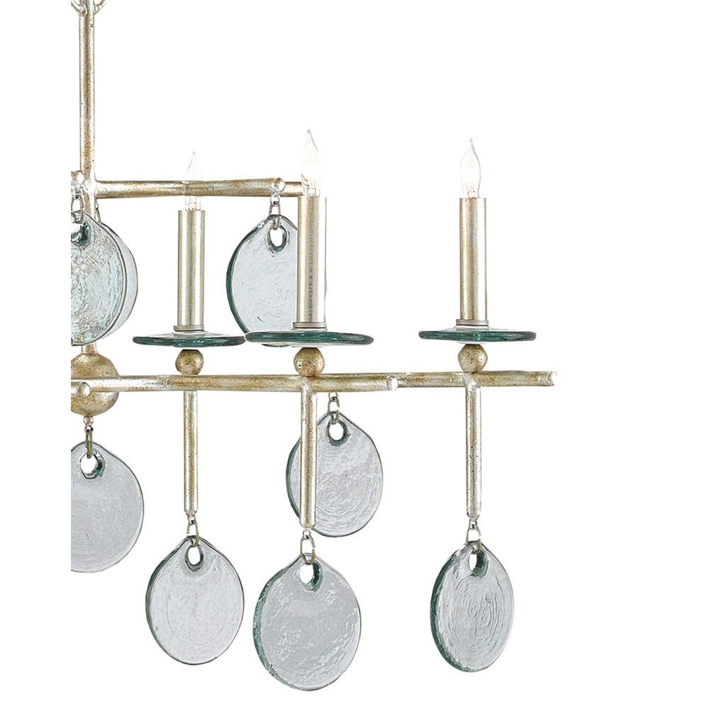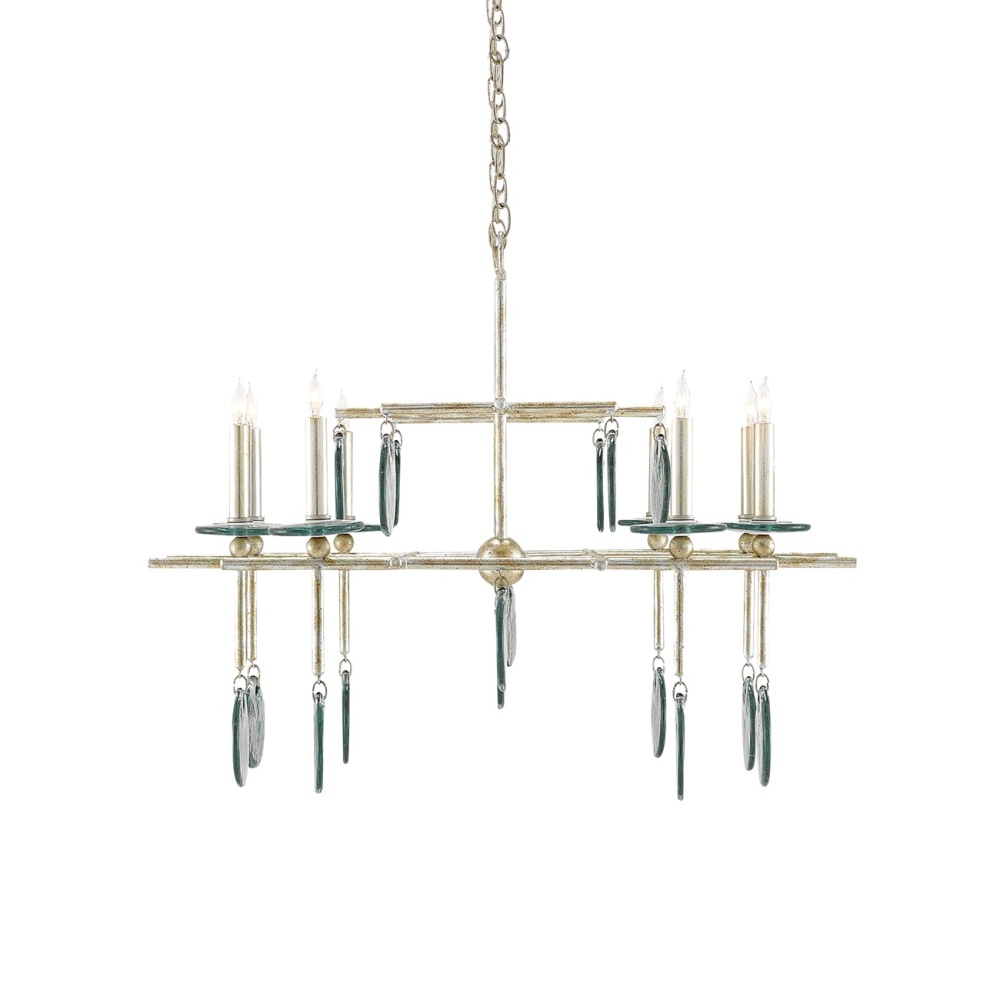 Though geometrically astute in its appearance, this silver version of the Sethos Rectangular Chandelier takes its ornamentation seriously. The linear wrought iron frame has been treated to a silver Granello finish to give the design a bit of sheen. The discs of recycled glass dangling from the arms of the eight-light fixture also glint when light pierces them. The unusual appearance of this chandelier will appeal to those who have grown weary of the ubiquitous candelabra. We also offer this fixture in an old iron finish.
