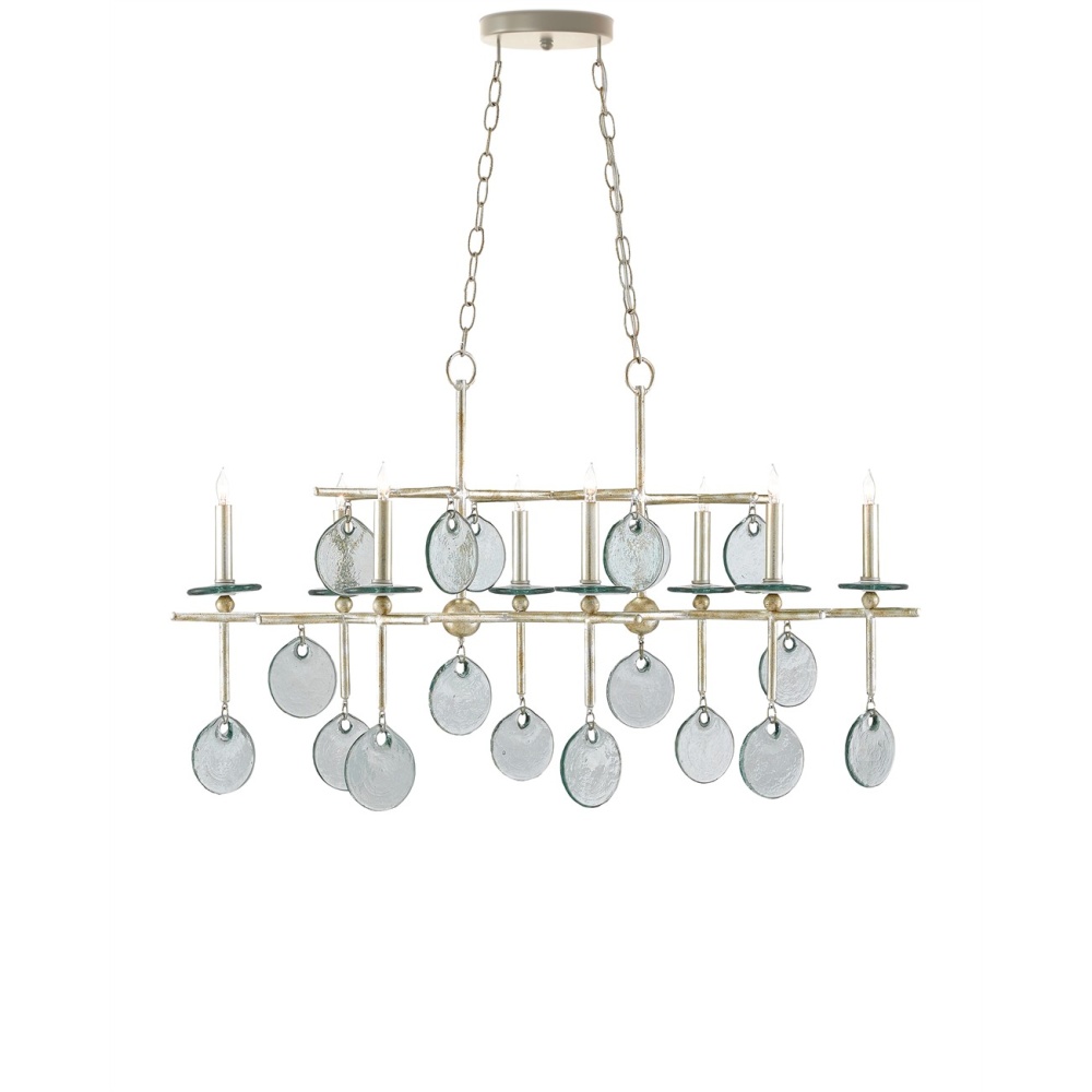 The Sethos Silver Rectangular Chandelier has a linear wrought iron frame in a silver Granello finish that refences early American antiques. This and the discs of recycled glass dangling from its arms bring the silver chandelier a nostalgic feel. Adjustable from 28" to 97" with use of included chain/rod kit/cable. If your space calls for a longer drop, additional chain/rods/cable is available for purchase.