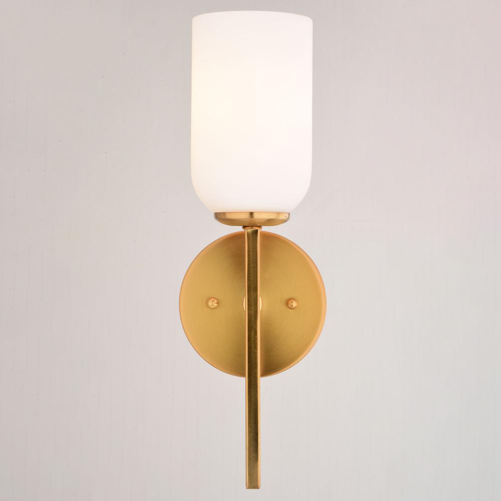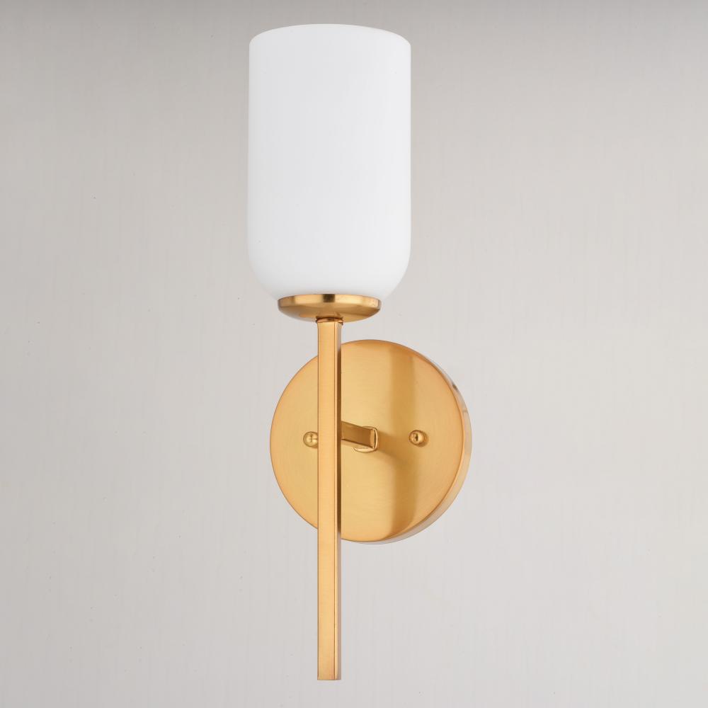 Illuminate your bathroom, bedroom, or living room with the Shelby Wall Light. Its classic design and natural brass finish add a touch of timeless sophistication for both transitional and contemporary spaces. The elongated white dome-shaped glass shade emits a soft, diffused light, creating a warm and inviting atmosphere that's perfect for relaxing or hosting.