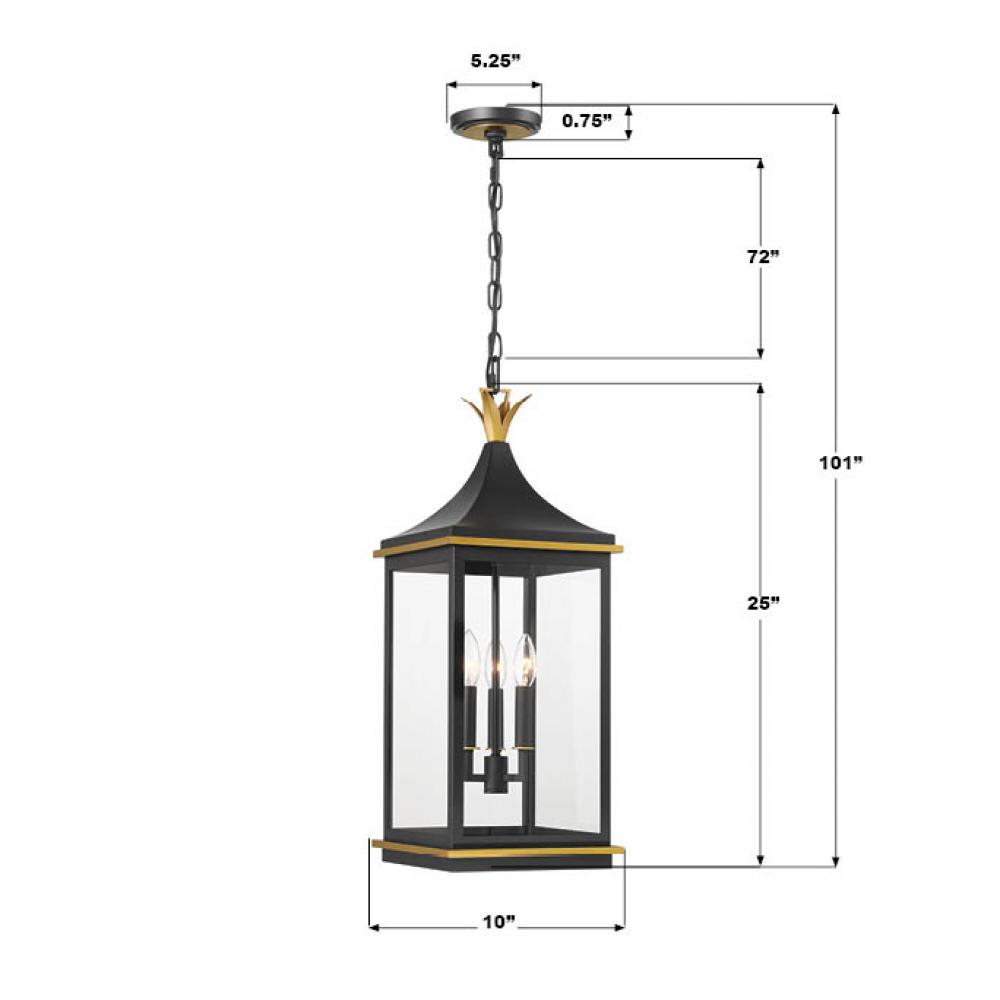 The Simpson Outdoor Collection features a lantern-style design with a two-tone finish. Its elongated rectangular frame, elegant glass panels, and candelabra bulbs create a classic look with a contemporary edge. The collection includes two options for customizing the top: a gold crown cap for a traditional flair or a sleek angled loop for a more contemporary appearance. This versatile design adds a stylish touch to any outdoor setting.