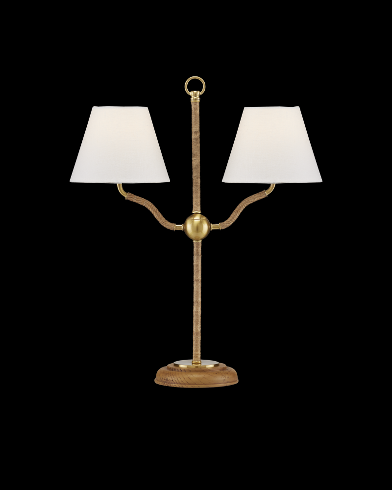 The Sirocco Desk Lamp features a light profile, with all but the main decorative elements wrapped in jute rope. These include the ring at its apex, the small globe connecting the forked arms, and the base itself. Made of wood and plated antique brass, the rope desk lamp is fitted with two off-white linen shades. This dressy desk lamp is designed to be a decorative and functional accent in a space.