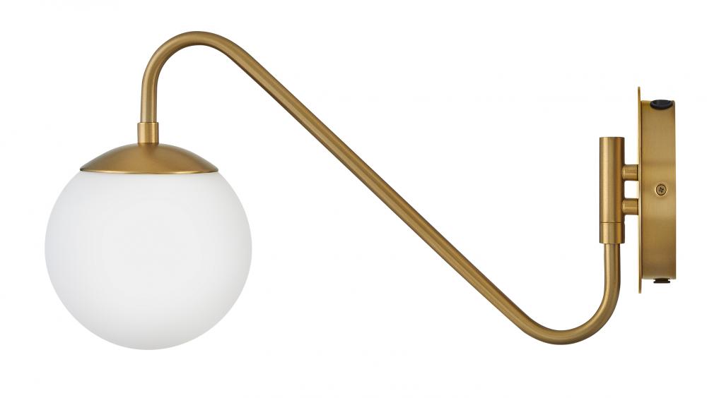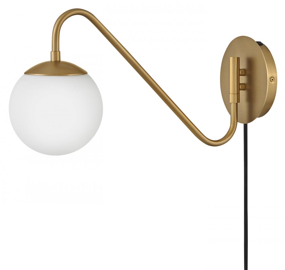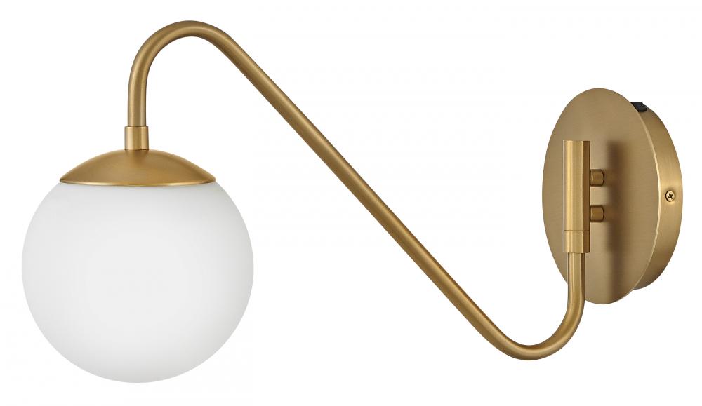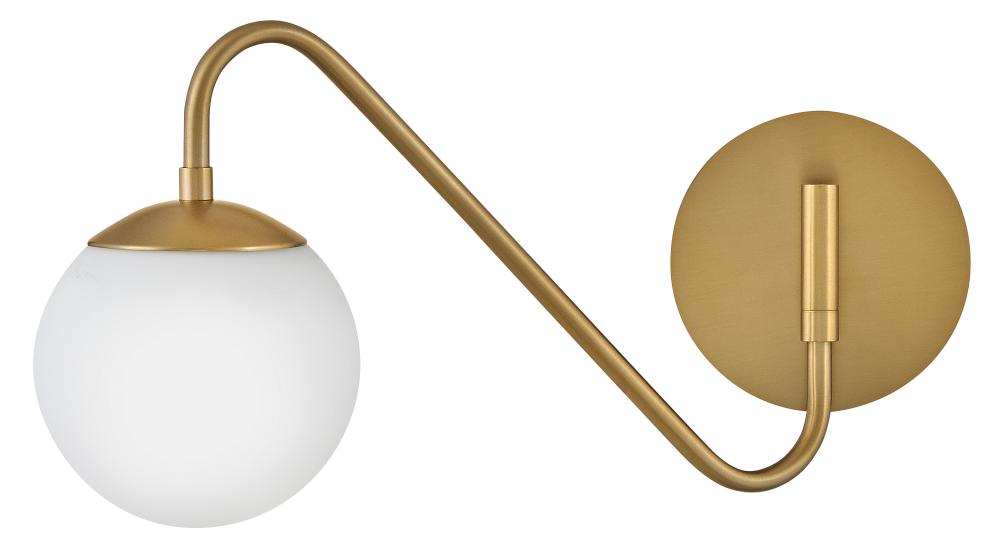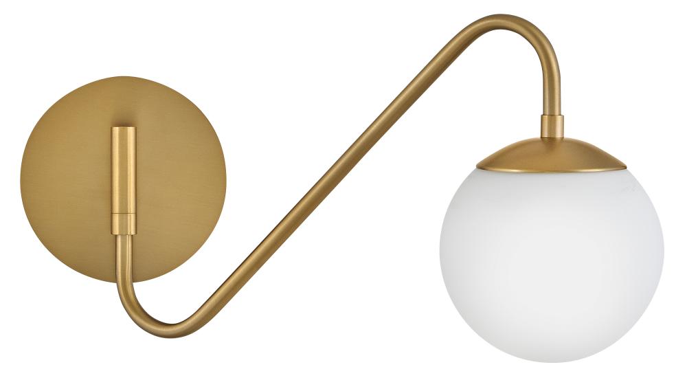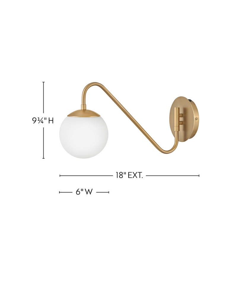 Fun and functional meets mid-century modern with Dottie, a single light sconce that seamlessly blends high style and practicality. A meandering arm with an articulating design extends from thebackplate, delicately gripping the etched opal globe to emit a warm, enveloping glow. It’s the perfect task light for next to the bed or over a kitchen counter.