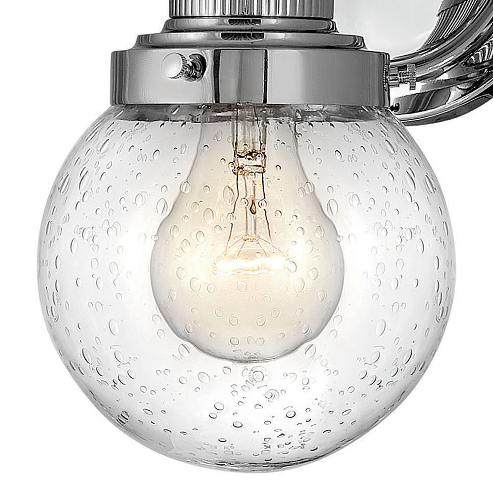 Poppy features clear glass spheres that bubble out of the refined, ribbed Chrome or Heritage Brass fitters to create a simple, yet sophisticated silhouette. An elegant, stepped backplate and crisp crossbar anchor this airy design. Poppy showcases mid-century style with a spectacular spin.