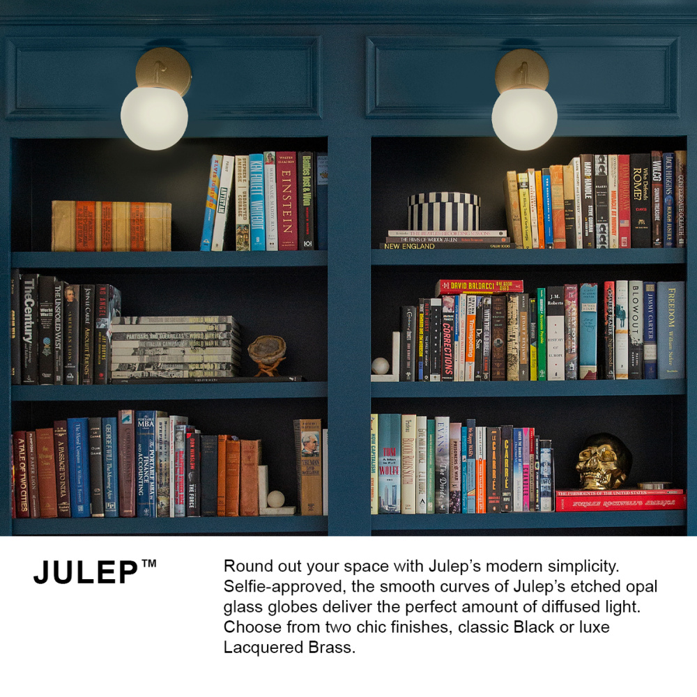 Round out your space with Julep’s modern simplicity. Selfie-approved, the smooth curves of Julep’s etched opal glass globes deliver the perfect amount of diffused light. Choose from two chic finishes, matte Black or luxe Lacquered Brass.