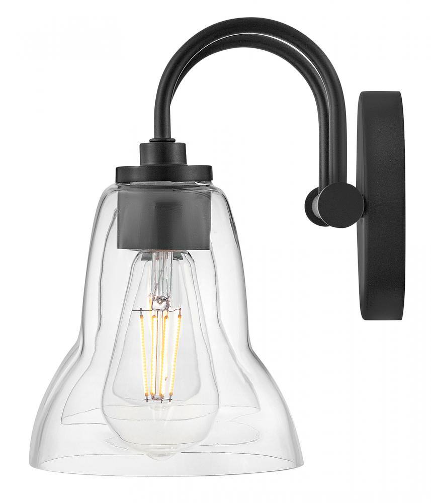 Vera’s unique, shapely form takes the traditional bell-shaped shades to a new level. Plenty of light shines up or down from the clear glass, making it a functional choice for main baths and powder rooms alike. Finished in Black or Lacquered Brass, Vera’s chic profile brings transitional style to any space.