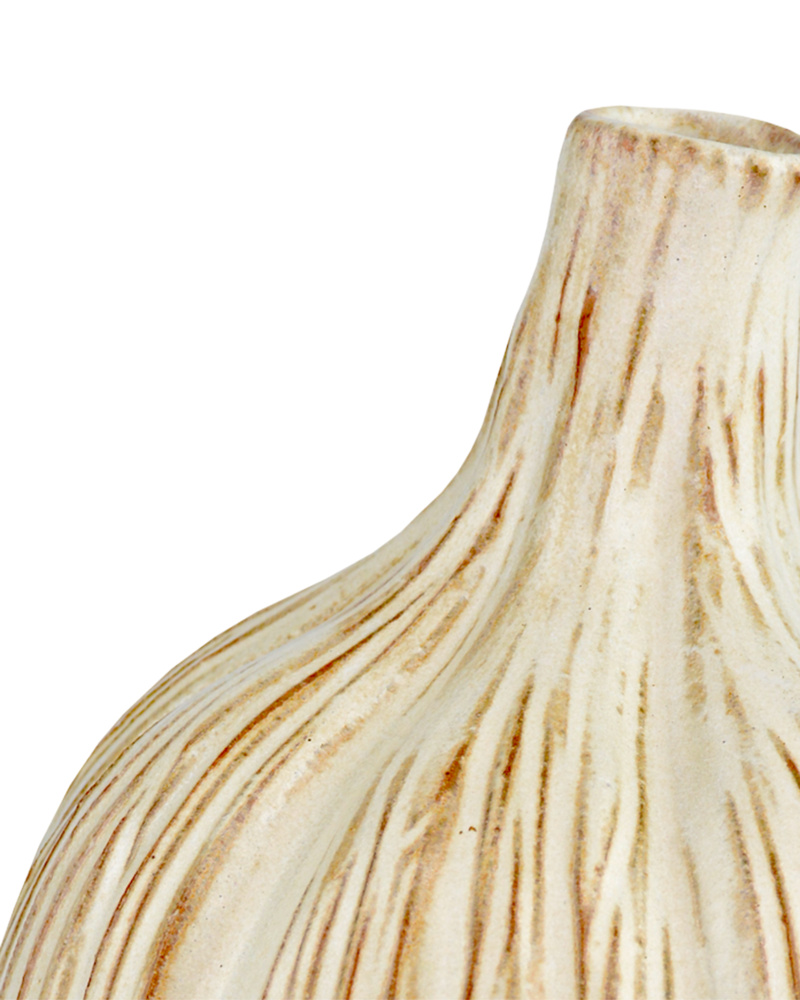The Small White Garlic Bulb is a sculpture inspired by Provençal pottery found in many of the small towns in the South of France. Made of terracotta, the milky white accessory has striations in the surface that are created when the glaze is scraped away to allow the natural color of the material to show through.