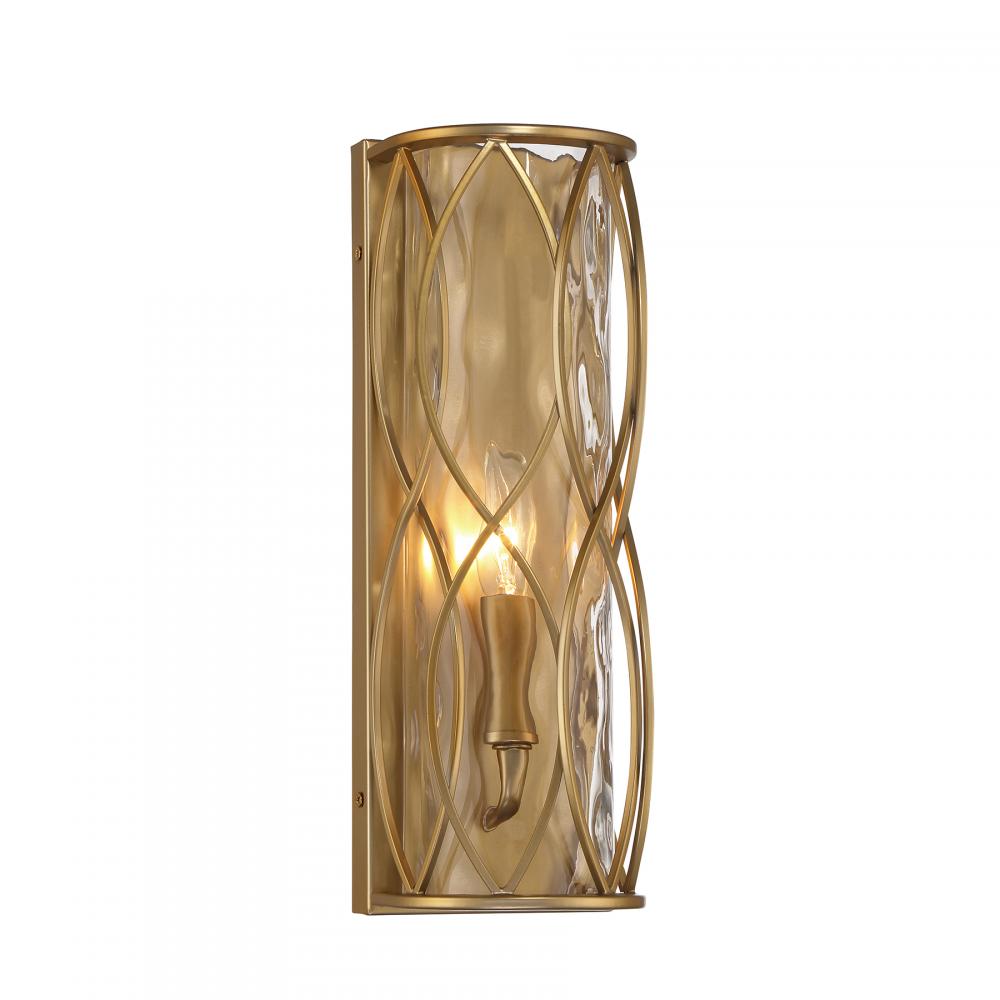 Get an unbelievably cool lighting look with the Savoy House Snowden 1-light sconce. Its tall, slim, cylindrical structure features an intricate curving design that perfectly accentuates the glacier glass shade within. Finished in Burnished Brass. Snowden is 14" in height, 4.75" in width and extends 4" from the wall. It uses a candelabra size bulb of up to 60 watts. The bulb is not included. This sconce is damp area rated.