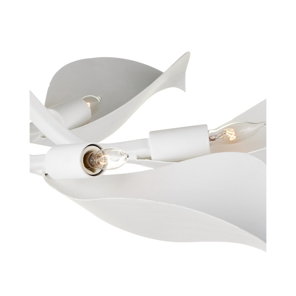 The big, beautiful blossoms of the Snowflower Semi-Flush Mount and the frame they flow from are made of wrought iron in a gesso white finish. Nodding toward the ceiling, the slightly folding petals direct the light upward. The crisp color of the finish will enhance the coolness of the illumination to create more brightness. The white semi-flush with its wild botanical personality will reflect any number of design styles with grace.
