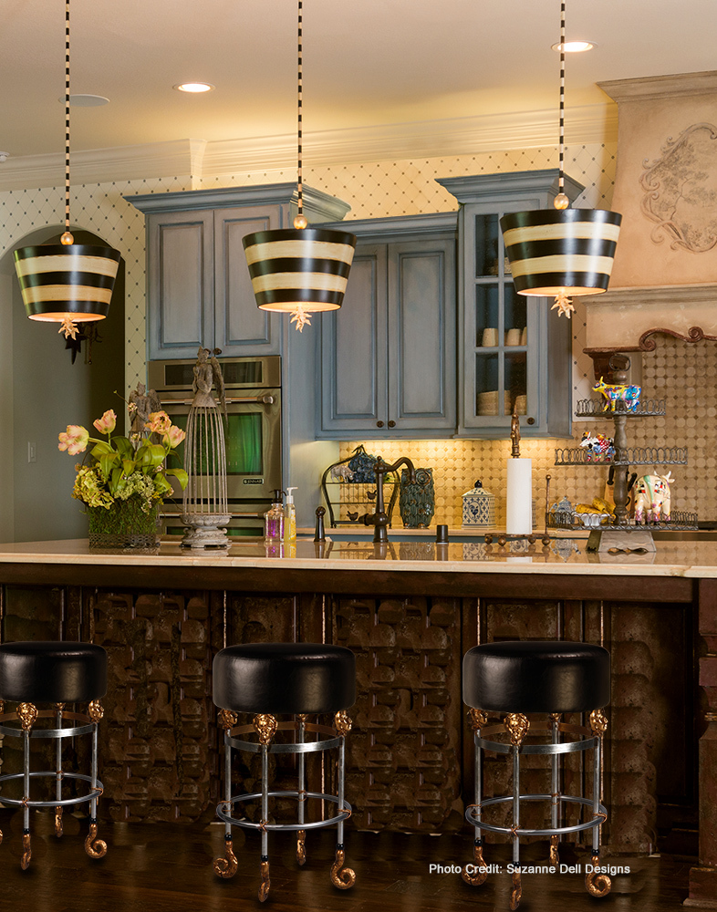 South Beach Pendant blends classic shape with a playful upside-down shade, adding unique flair to kitchens, bedrooms, or foyers. Includes striped stems for up to 60" height. Black, white, and antiqued gold accents exude timeless glam.