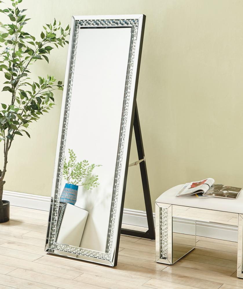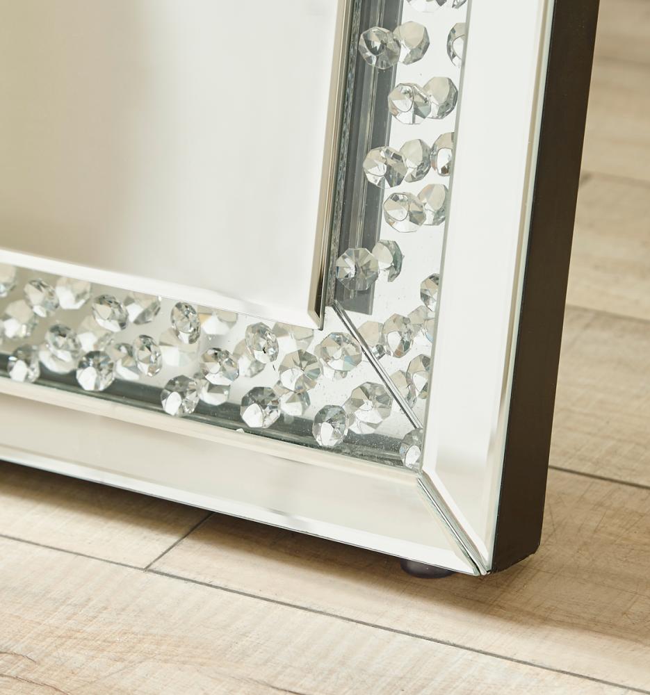 Make a striking statement in your home or office with this stunning contempo style clear mirror. Featuring dozens of expertly cut, beveled edge mirror pieces, layered together to create a bold, yet elegant textured look, you can adorn any promintnt wall with this dazzling contemporary mirror and be sure to catch people’s attention. · Contempo style clear mirror · Mirrors and all surrounding panels are made with beveled edges ·