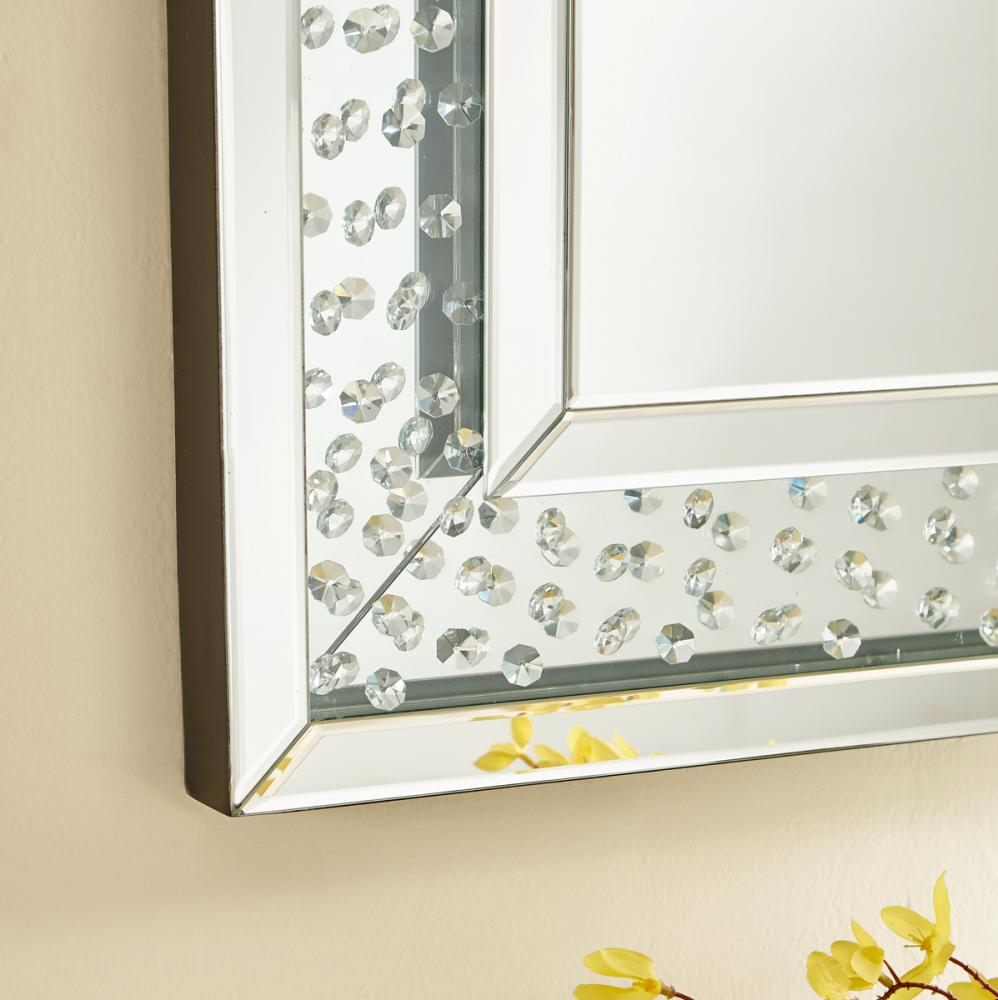 The Sparkle collection has crystal gems all over inside , crystals and silver mirror reflect shine. It combine both the function and decoration to set your house. Make a striking statement in your home or office with this stunning contempo style clear mirror. Featuring dozens of expertly cut, beveled edge mirror pieces, layered together to create a bold, yet elegant textured look, you can adorn any promintnt wall with this dazzling contemporary mirror and be sure to catch people’s attention. · Contempo rectangular sunburst style clear mirror · Mirrors and all surrounding panels are made with beveled edges