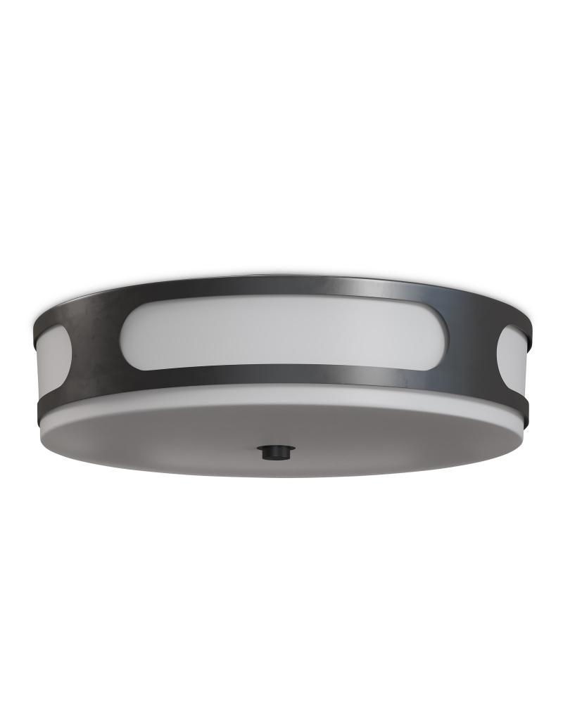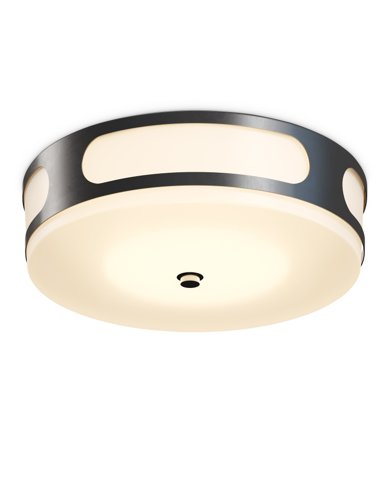The Swale Outdoor Flush Mount has a graphic silhouette with cut outs where illumination can escape. The sides of the black flush mount are covered with a milky white glass that illuminates uniformly when the integrated LEDs shine through it. The metal is powdercoated to make this outdoor flush mount weather-worthy.