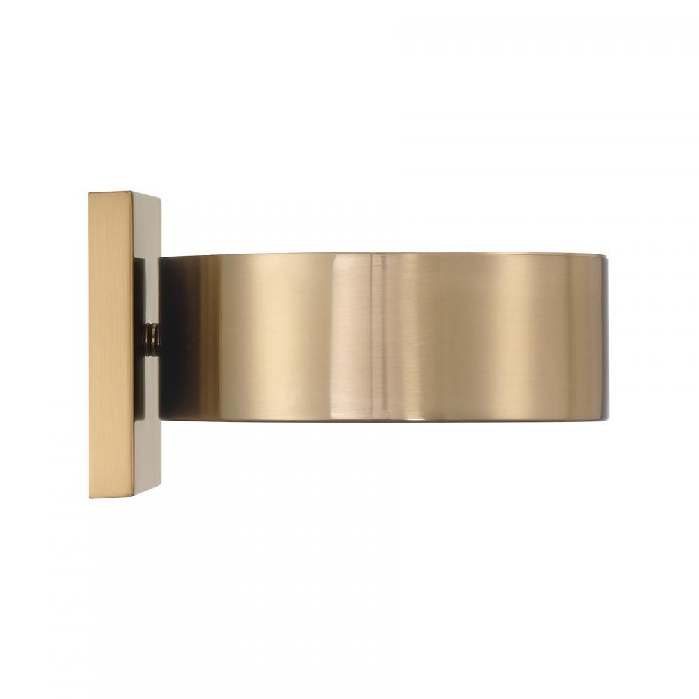 The Savoy House Talamanca 1-light sconce is part of Moderne by Breegan Jane, bringing her signature approachable modern luxury style to your home. Breegan loves the timeless and elevating beauty of brass, as seen in this chic and sleek design. An integrated LED light source is held inside a round structure mounted to a square backplate, creating a clean look that is perfect for adding a pop of light in any spot. Finished in champagne-toned Noble Brass. Talamanca is 4.75" in height, 8" in width and extends 8.25" from the wall. Damp area rated.