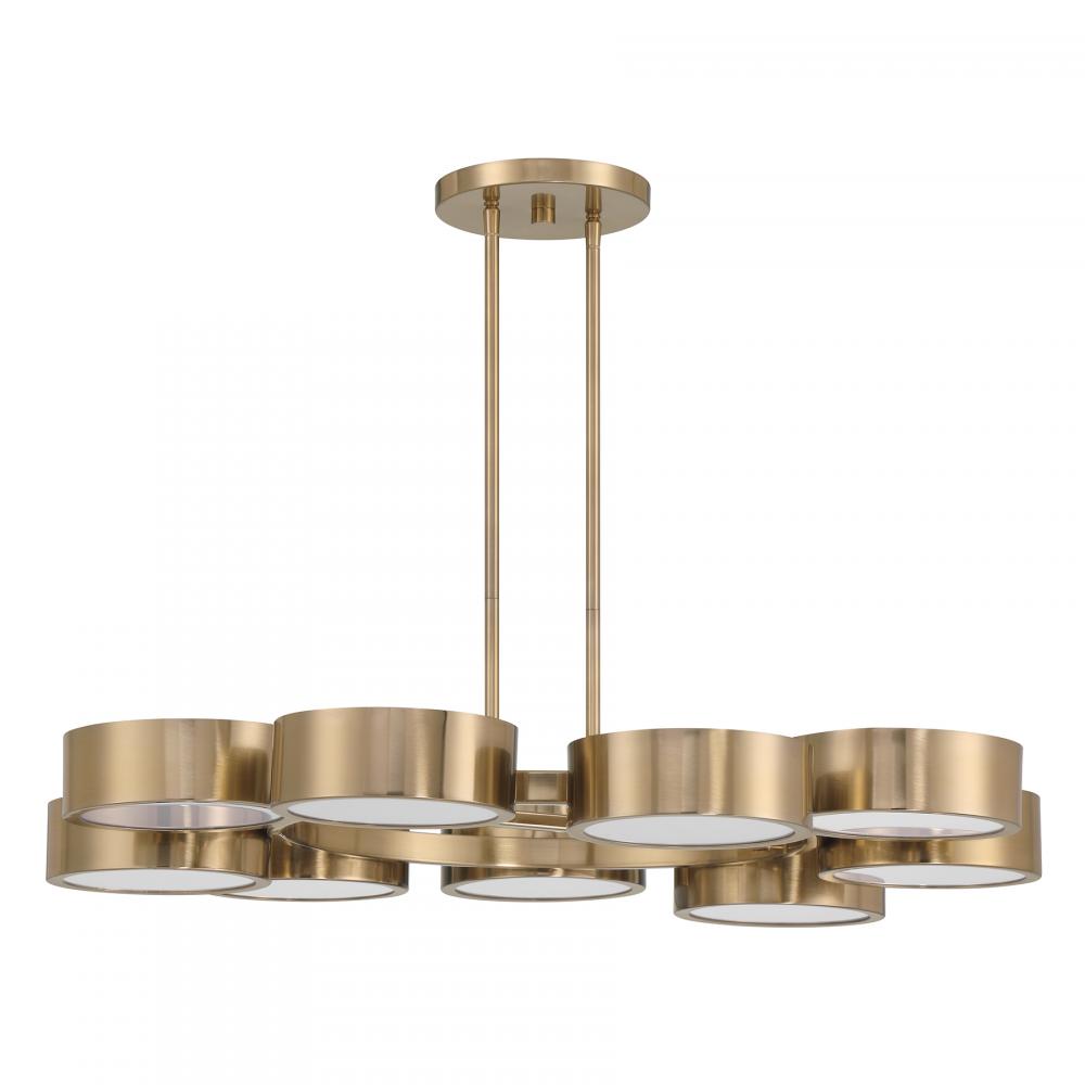 The Savoy House Talamanca 9-light chandelier is part of Moderne by Breegan Jane, bringing her signature approachable modern luxury style to your home. Breegan loves the timeless and elevating beauty of brass, as seen in this chic and sleek design. Integrated LED light sources are held inside round structures studding a central hoop, creating a clean look that is perfect for adding a big boost of light to a room. Finished in champagne-toned Noble Brass. Talamanca is 32" in width and has an adjustable height ranging from 4" to 60". Comes with eight 12" downrods and two 6" downrods.