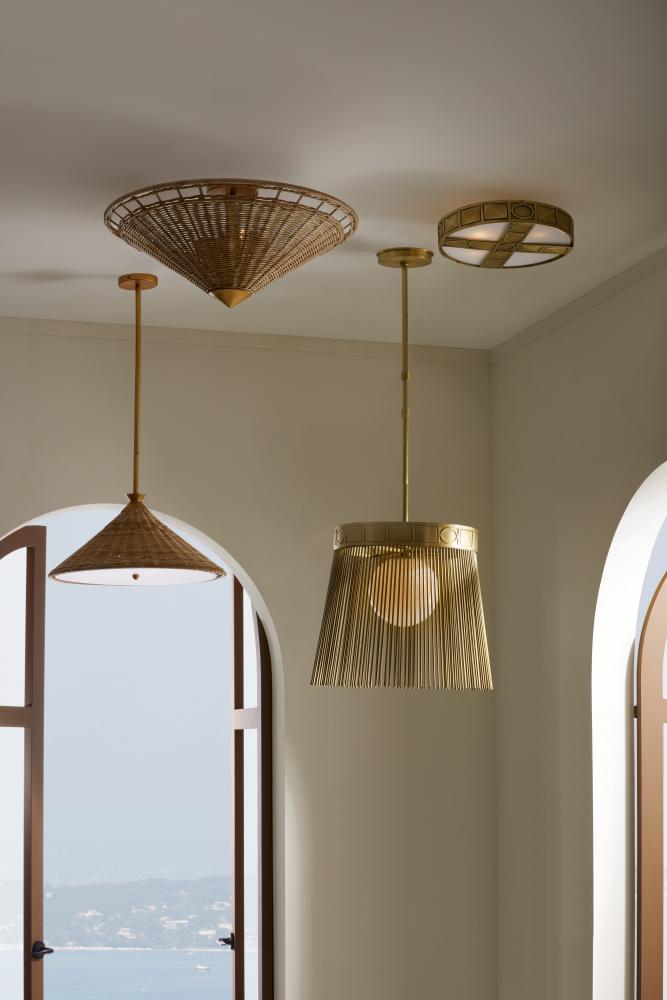 A continuation of the Terrace family, this pendant is made up of natural, handwoven rattan that brings a caribbean sophistication feel to the piece. With accents crafted of gold steel finished iron, the contrast points accentuate the whimsical silhouette.