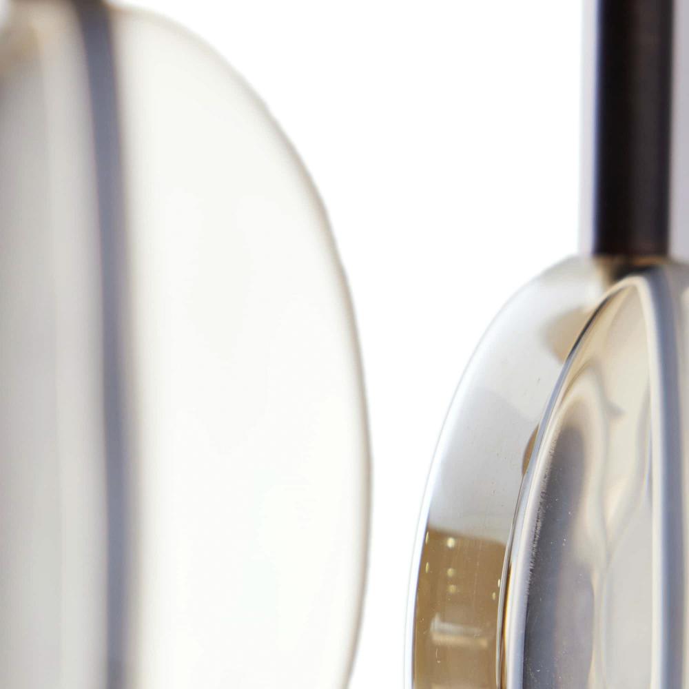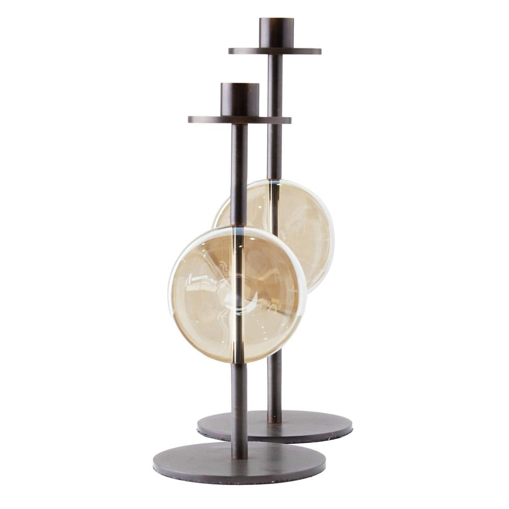 MOODY AND MODERN, THIS PAIR OF CANDLEHOLDERS FEATURE DISCS OF CHAMPAGNE CRYSTAL SUSPENDED AMID BRONZE-FINISHED STEEL STEMS AND ROUND BASES. TOP ANY SURFACE WITH THE MIXED-MEDIA TAPER-HOLDERS FOR A SOFT LAYER OF ILLUMINATION.