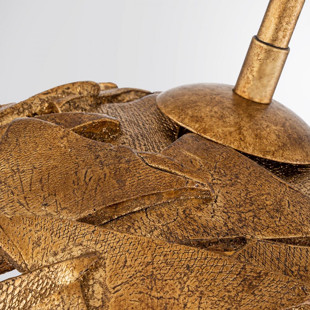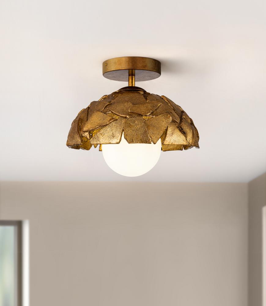 Mosaic Luxe 10.5" light: frosted glass center for even down light contrasts textured gold leaf strips in a bold pattern. Functional as a pendant or semi-flush mount.