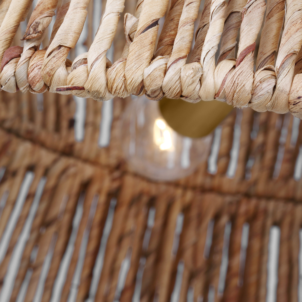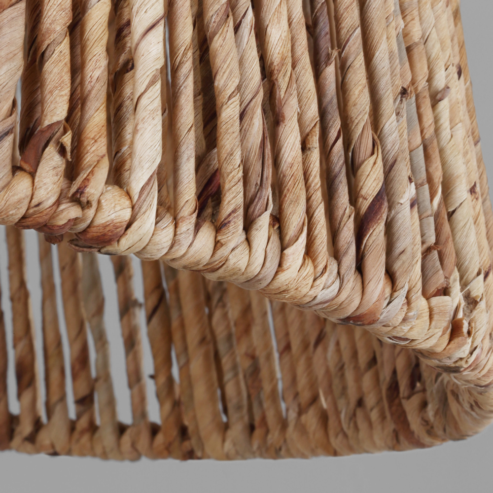 Make a bold style statement with the coastal-inspired organic Thurlo series by Drew & Jonathan Scott. Crafted of natural abaca rope, hand wrapped around the frame for a modern bohemian style and accented with a metal band for a tailored look. Filtering the light from within, each piece creates a play of light and shadow in a room, adding an inviting ambiance.
