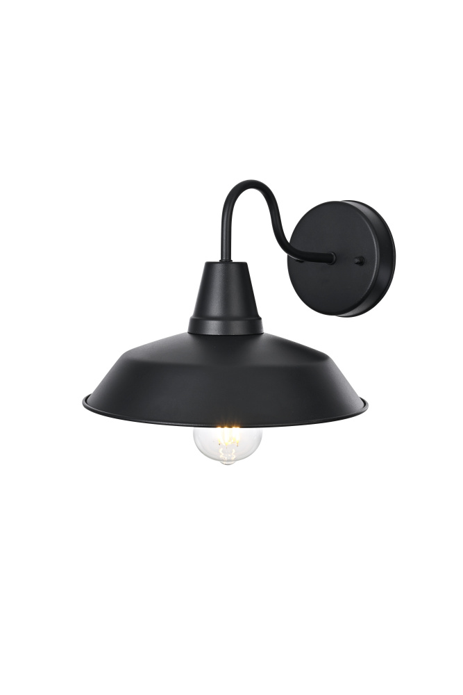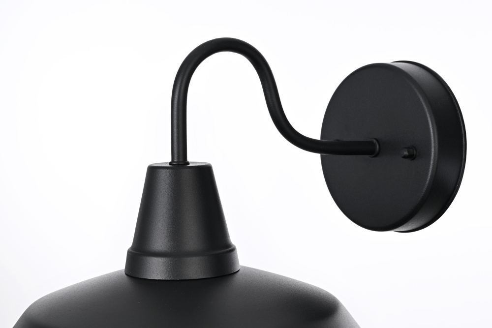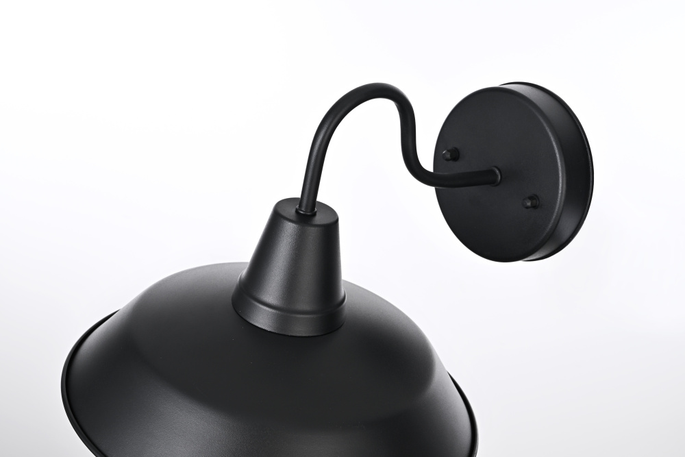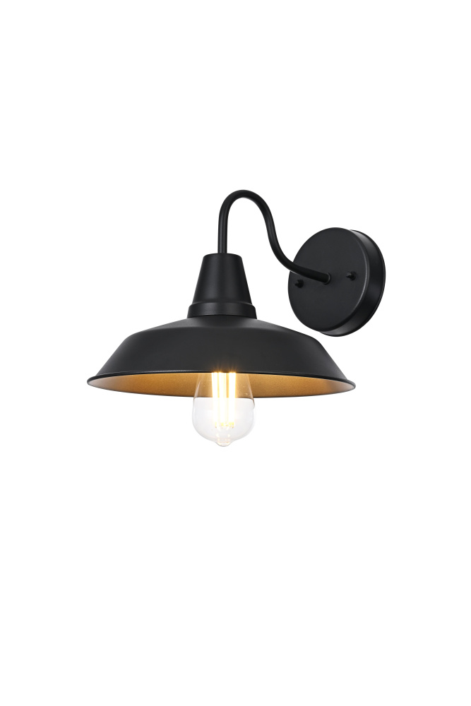 This outdoor wall light brings a timeless barn-style aesthetic to exterior spaces, featuring a flared metal shade, curved gooseneck arm, and contrasting black-and-gold finish. The wide metal shade directs light downward, while the gold interior enhances brightness with a warm, reflective glow. Built from sturdy iron, this fixture is ETL Wet Rated for durability in porches, patios, garages, and farmhouse exteriors. The compact 5-inch round backplate provides a secure mount, and the dimmable functionality allows for adjustable brightness when paired with a compatible dimmer. Designed for a medium-base E26 bulb (not included), this fixture blends practical lighting with industrial character, making it a strong and stylish addition to any outdoor space. Built with marine-grade, corrosion-resistant aluminum, this sconce withstands coastal conditions for long-lasting durability.