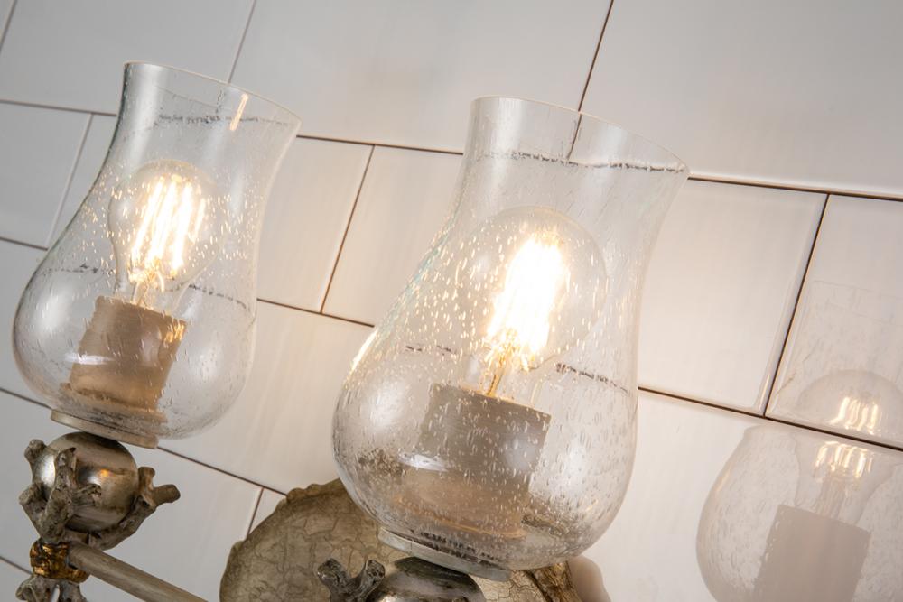 A 3-light vanity mixing vintage and modern with seedy glass hurricane shades, a cream-silver oval backplate, and gold-silver orb accents. Gold-brown edging adds depth, perfect for a fresh bathroom or living room design.