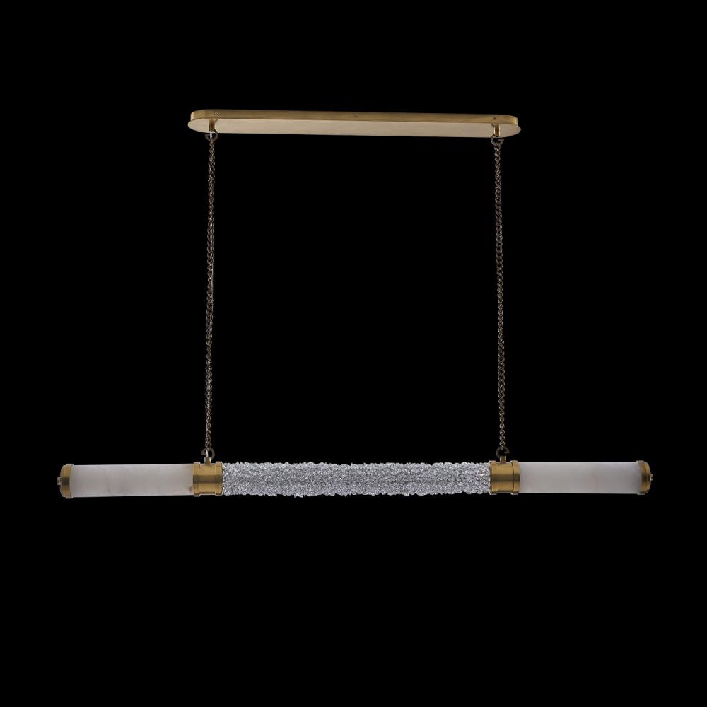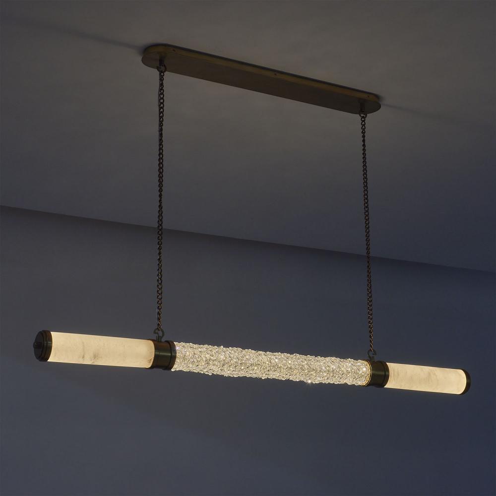 The Tubo features the layering of natural materials such as Alabaster, brass, and crystals to create complex beautiful textures that play with light. Add natural luxury to your living space with these Art Deco linear pendants that are offered in a Natural Brass finish and integrated LED lamping.