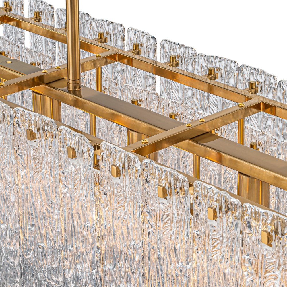 The Tundra Linear Grand extends the collection’s glacier-inspired aesthetic into a bold linear design. Two stacked rows of artisanal textured glass create a waterfall of refracted light, ideal for elongated dining tables, kitchen islands, or hospitality interiors. Its crisp geometry and luminous depth make this piece a signature Kanova statement.