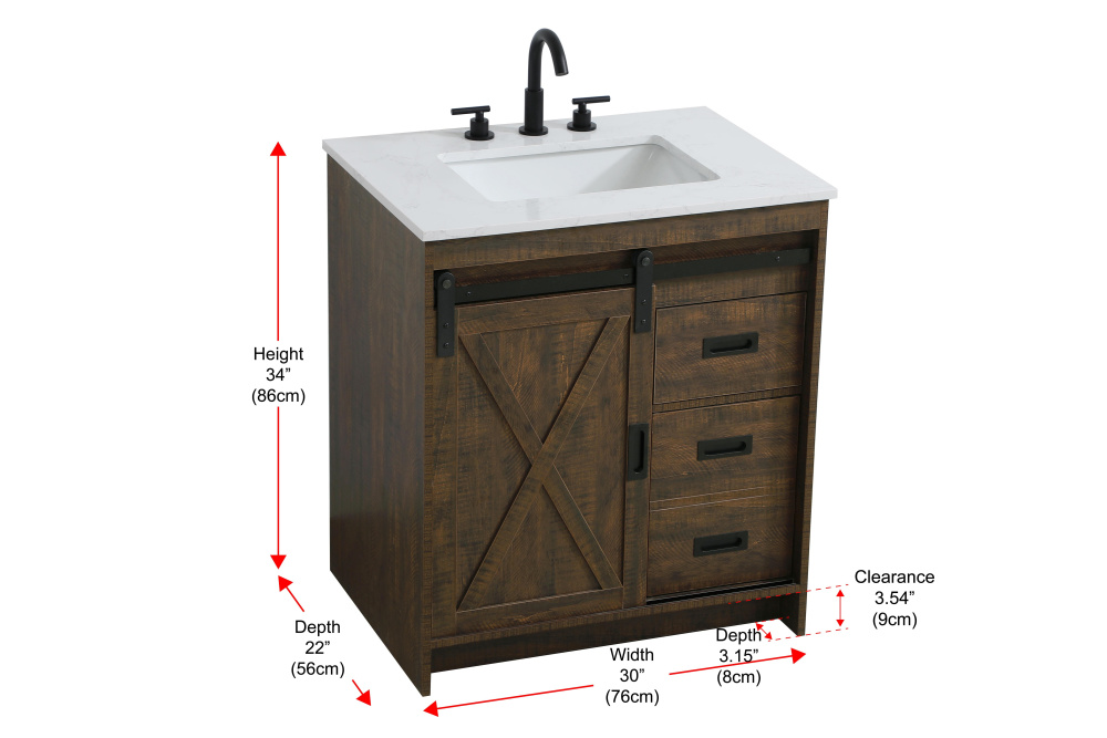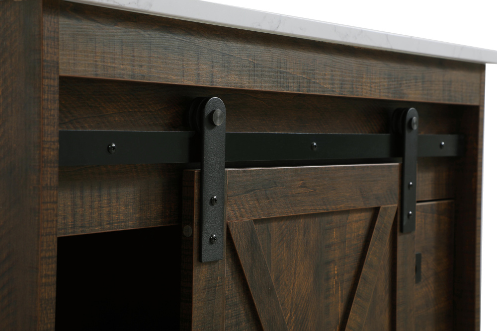 Transform your bathroom with this rustic barnyard-style vanity, designed to balance aesthetic appeal and functionality. Featuring a sliding barn door with black metal hardware and complementary handle pulls, this piece blends rugged charm with practical design. The engineered marble countertop displays unique marbling, while the porcelain undermount sink offers easy maintenance and durability. Available in Espresso, Natural Oak, and Rustic Grey finishes, this vanity suits a range of styles. It includes a deep storage drawer for larger items, a hidden shelf for towels or décor, and adjustable foot levelers for added stability on uneven floors. With pre-drilled faucet holes for easy setup, this vanity delivers style and substance to enhance your bathroom.