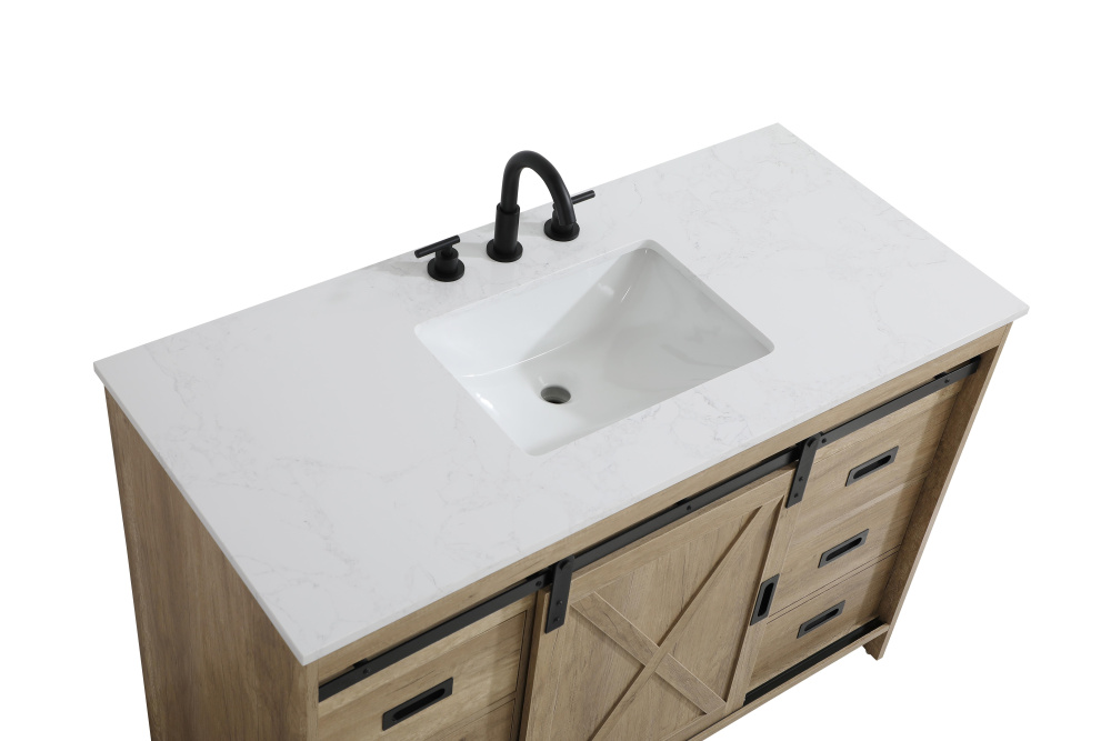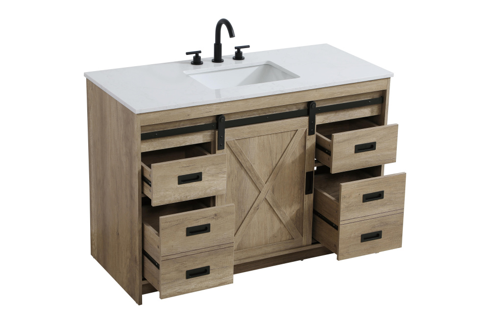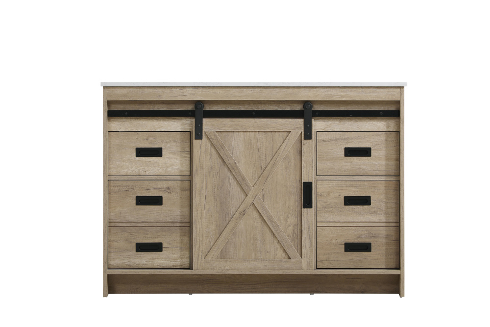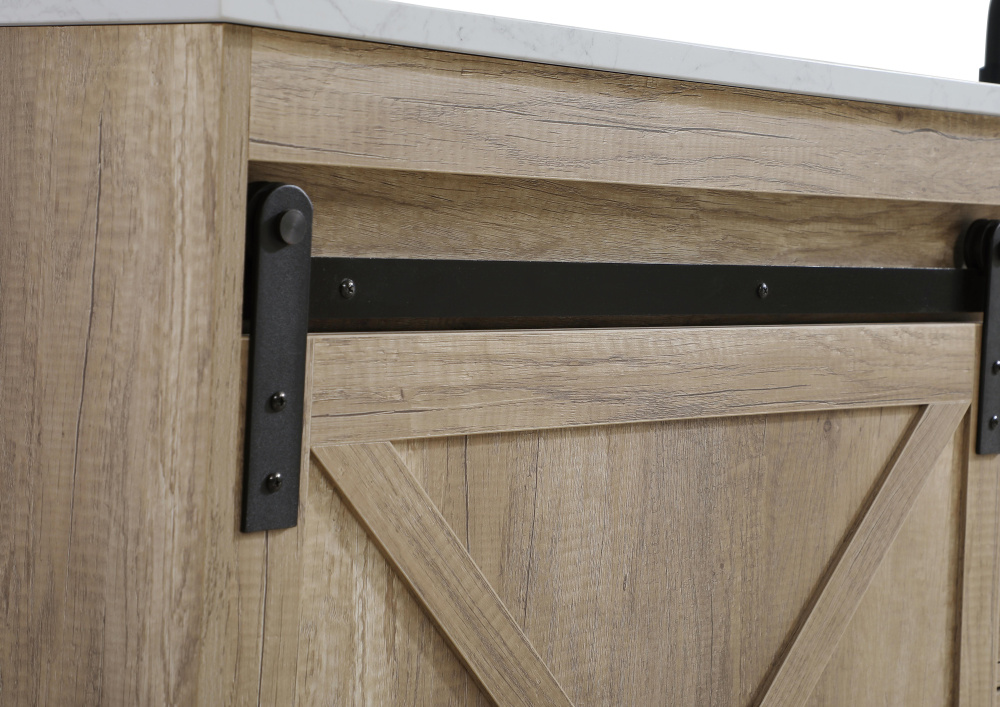 Transform your bathroom with this rustic barnyard-style vanity, designed to balance aesthetic appeal and functionality. Featuring a sliding barn door with black metal hardware and complementary handle pulls, this piece blends rugged charm with practical design. The engineered marble countertop displays unique marbling, while the porcelain undermount sink offers easy maintenance and durability. Available in Espresso, Natural Oak, and Rustic Grey finishes, this vanity suits a range of styles. It includes a deep storage drawer for larger items, a hidden shelf for towels or décor, and adjustable foot levelers for added stability on uneven floors. With pre-drilled faucet holes for easy setup, this vanity delivers style and substance to enhance your bathroom.