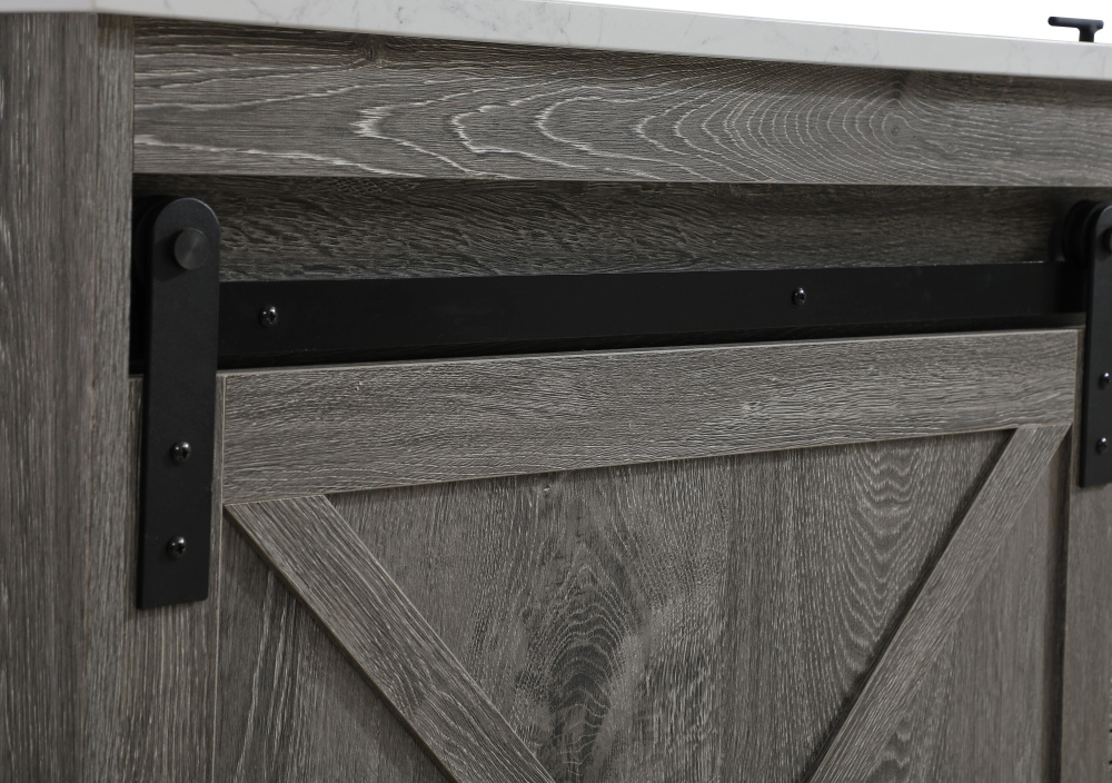 Transform your bathroom with this rustic barnyard-style vanity, designed to balance aesthetic appeal and functionality. Featuring a sliding barn door with black metal hardware and complementary handle pulls, this piece blends rugged charm with practical design. The engineered marble countertop displays unique marbling, while the porcelain undermount sink offers easy maintenance and durability. Available in Espresso, Natural Oak, and Rustic Grey finishes, this vanity suits a range of styles. It includes a deep storage drawer for larger items, a hidden shelf for towels or décor, and adjustable foot levelers for added stability on uneven floors. With pre-drilled faucet holes for easy setup, this vanity delivers style and substance to enhance your bathroom.