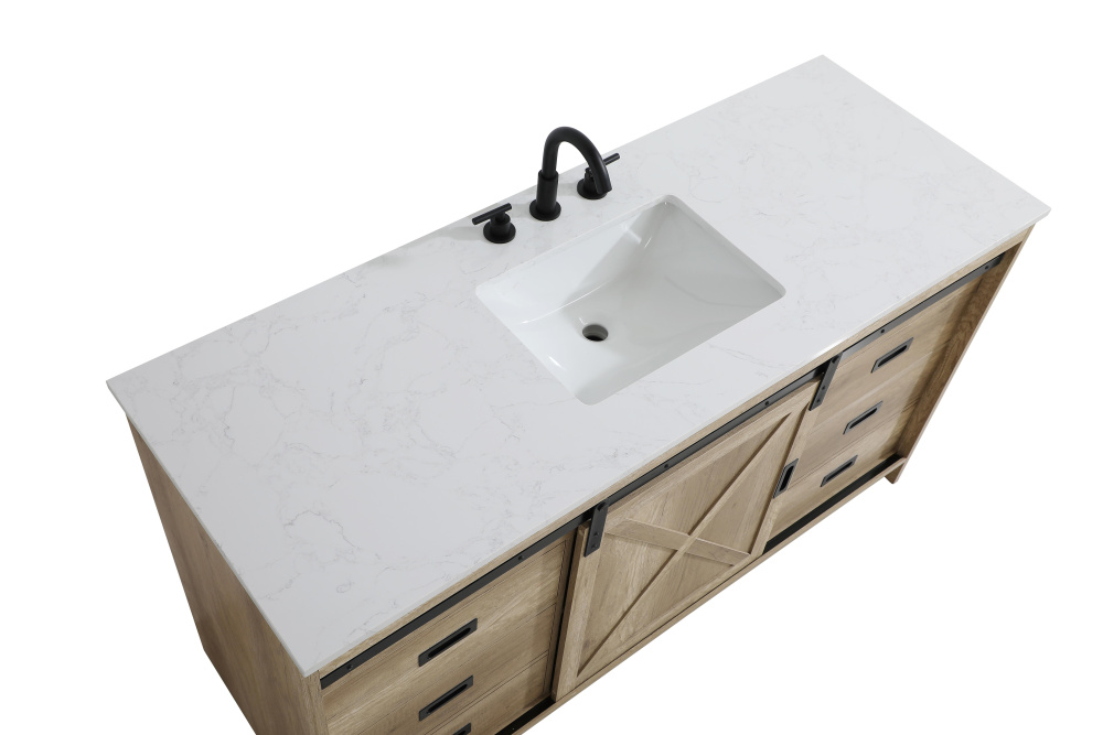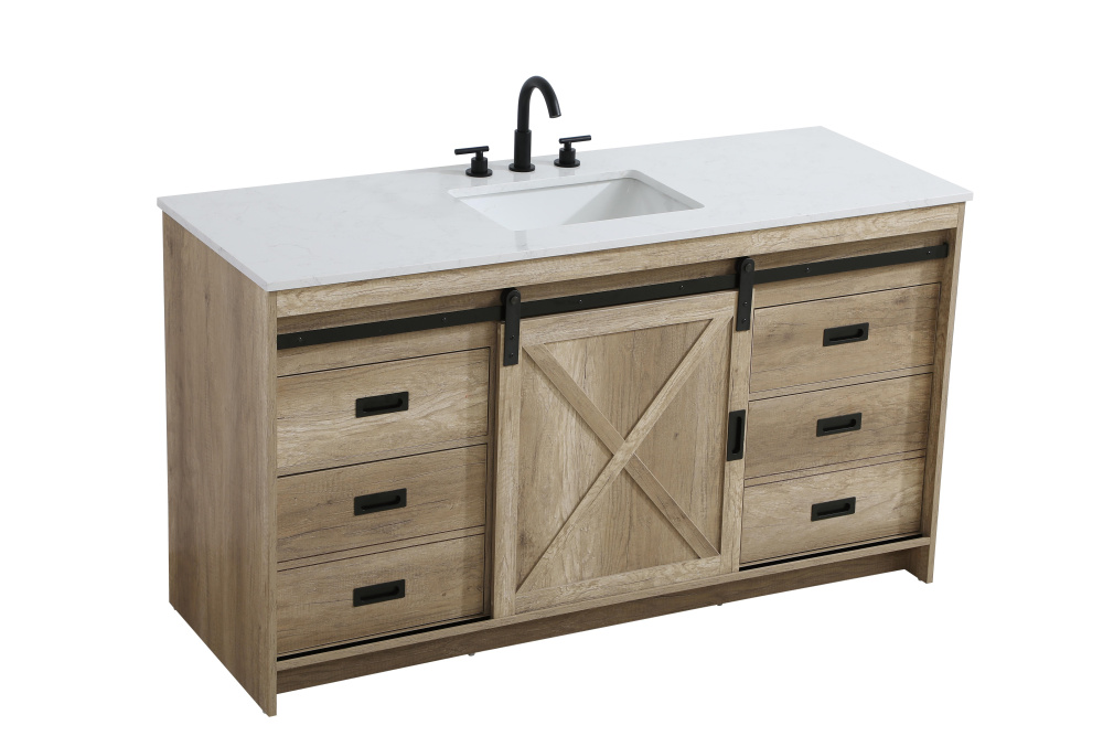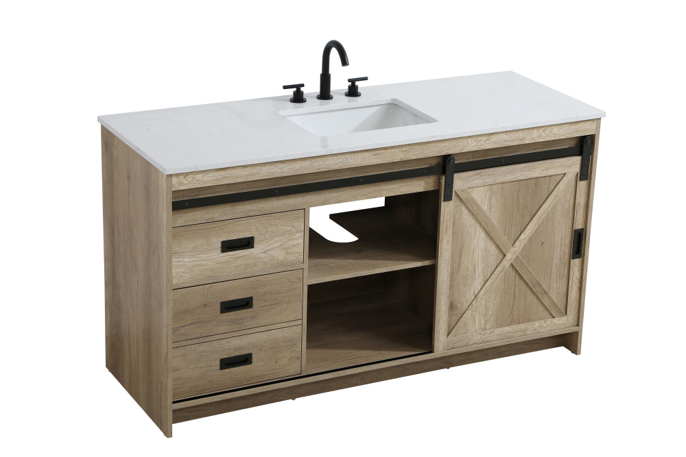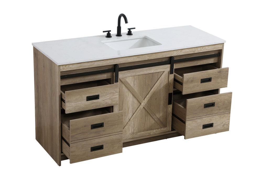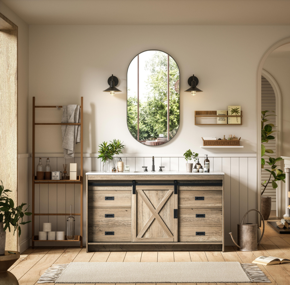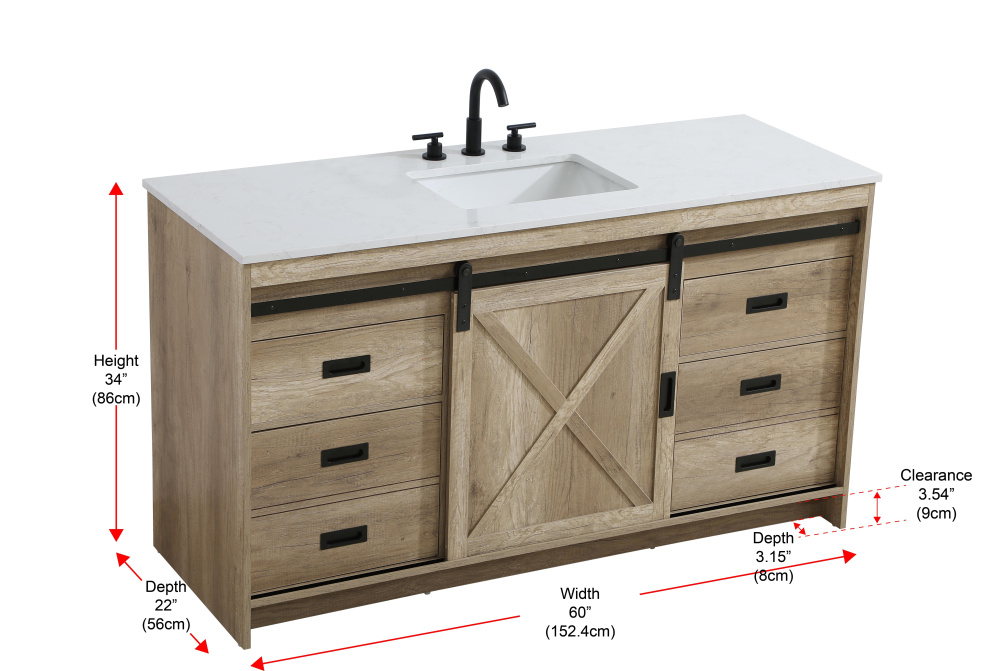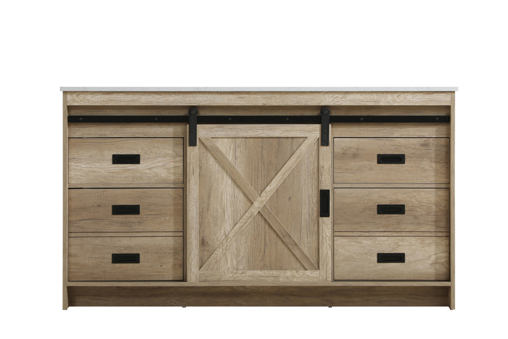 Transform your bathroom with this rustic barnyard-style vanity, designed to balance aesthetic appeal and functionality. Featuring a sliding barn door with black metal hardware and complementary handle pulls, this piece blends rugged charm with practical design. The engineered marble countertop displays unique marbling, while the porcelain undermount sink offers easy maintenance and durability. Available in Espresso, Natural Oak, and Rustic Grey finishes, this vanity suits a range of styles. It includes a deep storage drawer for larger items, a hidden shelf for towels or décor, and adjustable foot levelers for added stability on uneven floors. With pre-drilled faucet holes for easy setup, this vanity delivers style and substance to enhance your bathroom.