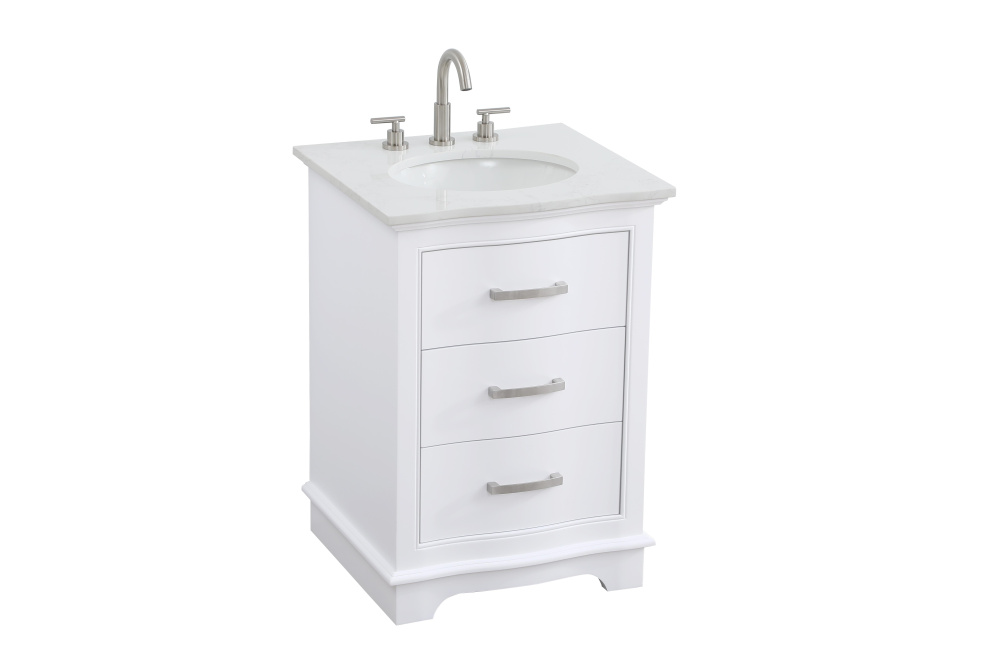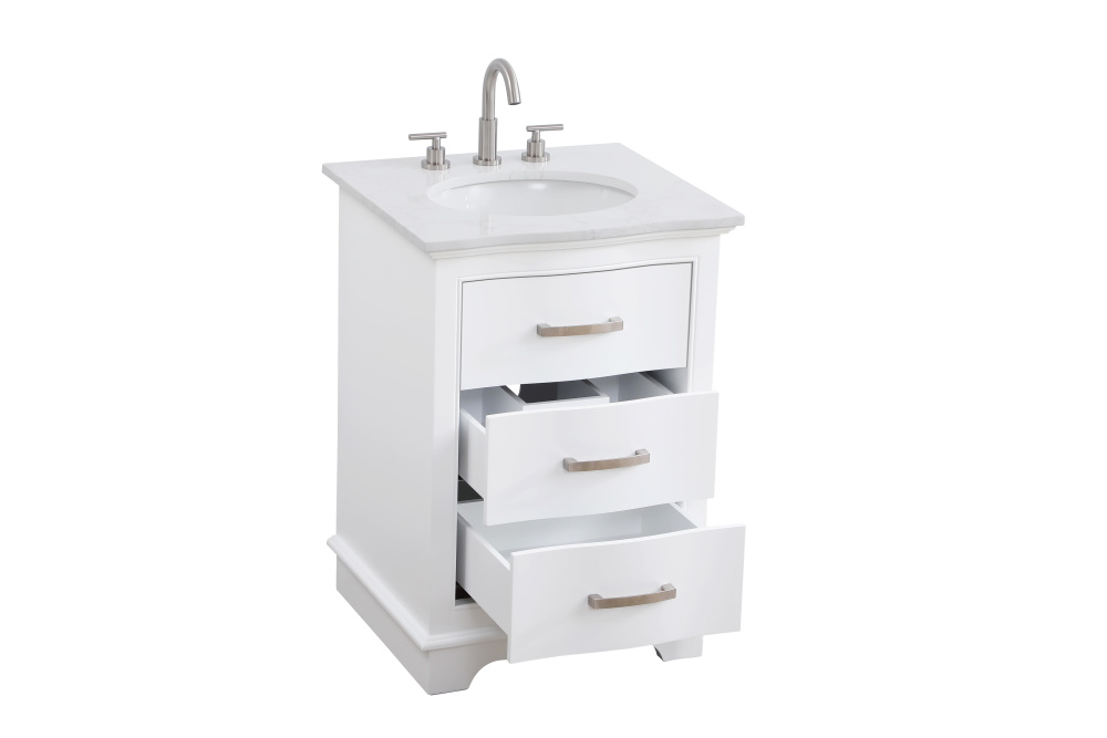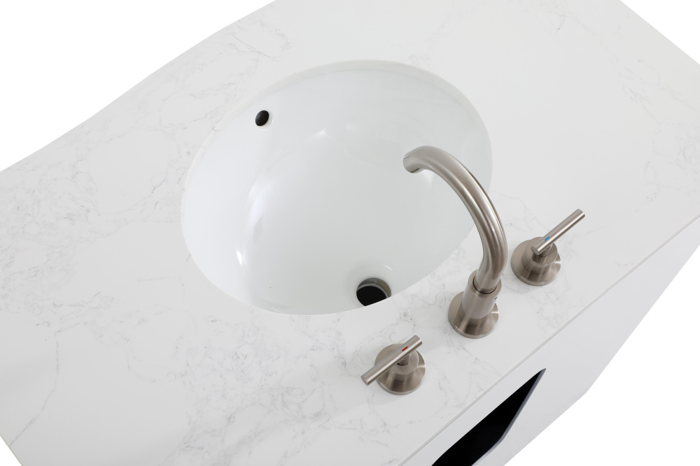 Enhance your bathroom with this expertly crafted vanity that combines functionality and timeless design. The slightly curved silhouette adds softness and sophistication, while the faux-marble countertop showcases unique veining for a one-of-a-kind look. Complete with a porcelain undermount sink, this vanity is available in White, Blue, and Grey finishes to complement any décor. Soft-closing drawers offer quiet and smooth storage access, including a U-shaped middle drawer designed to fit around plumbing. Built with solid wood and MDF for lasting durability, it also features adjustable foot levelers for stability and ships fully assembled, making it an effortless and stylish upgrade to your space.
