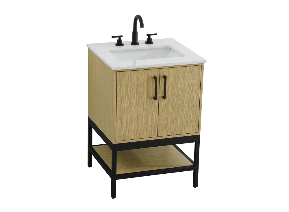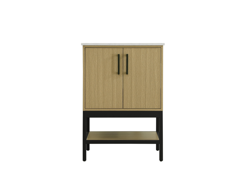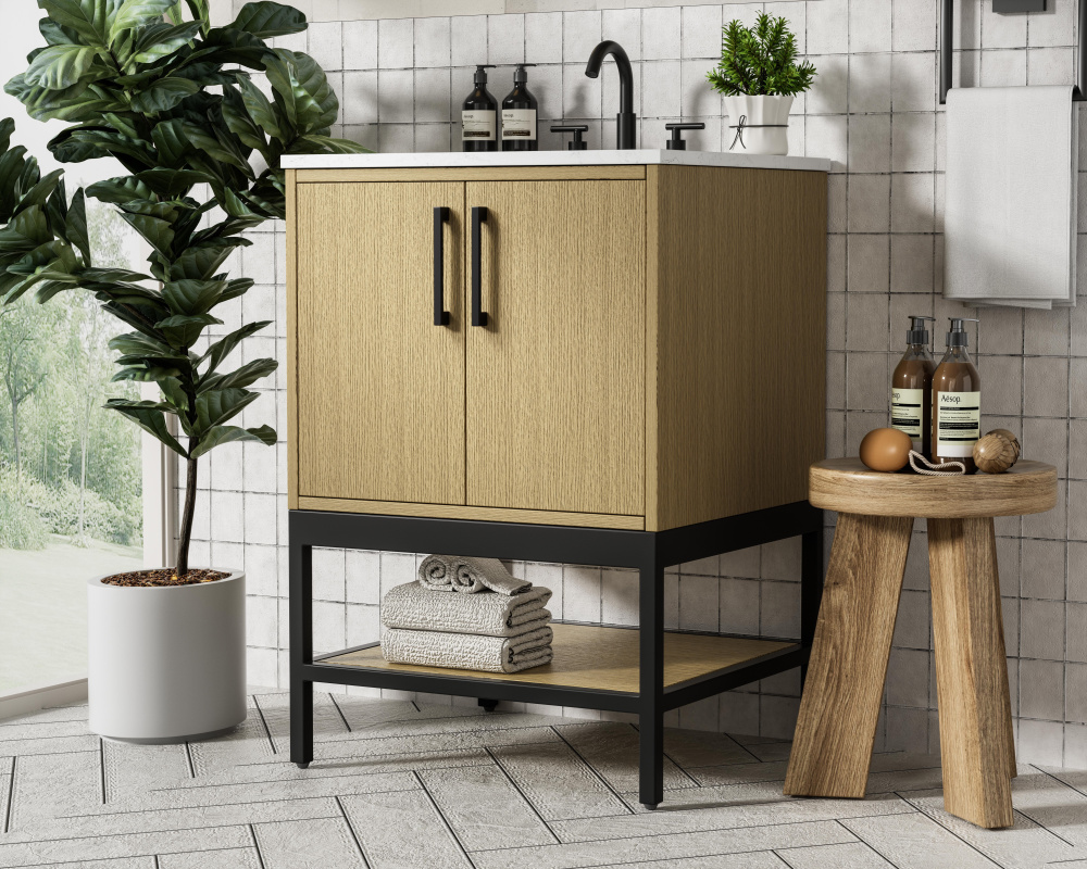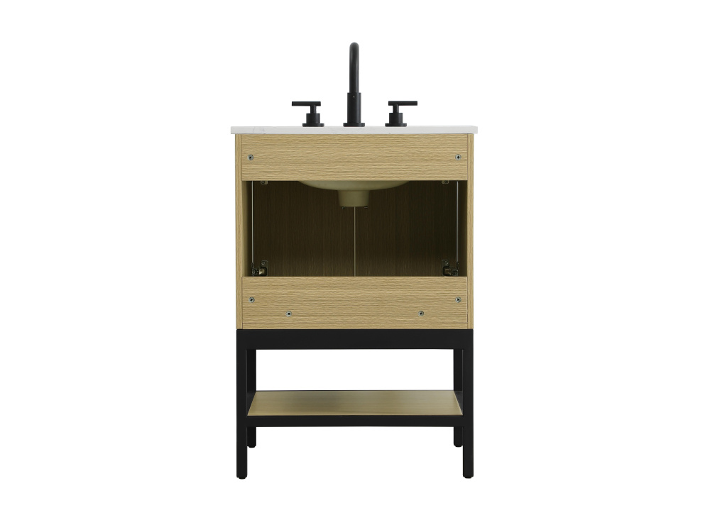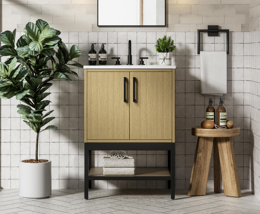 Upgrade your bathroom with this modern bathroom vanity that combines form and function effortlessly. Its sleek wood veneer cabinetry, paired with a bold black metal frame, brings a clean, contemporary vibe to any space. Designed with practicality in mind, the cabinet organizes your essentials, as well as an open lower shelf for added storage or display. The durable engineered marble countertop is built to withstand daily use, while the undermount porcelain sink ensures easy maintenance. Complete with matte black hardware and pre-drilled features for effortless installation, this vanity is the perfect centerpiece to refresh your bathroom with style and efficiency.