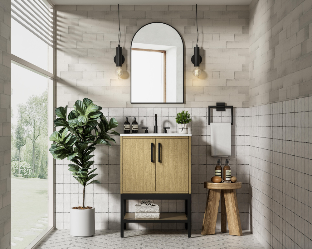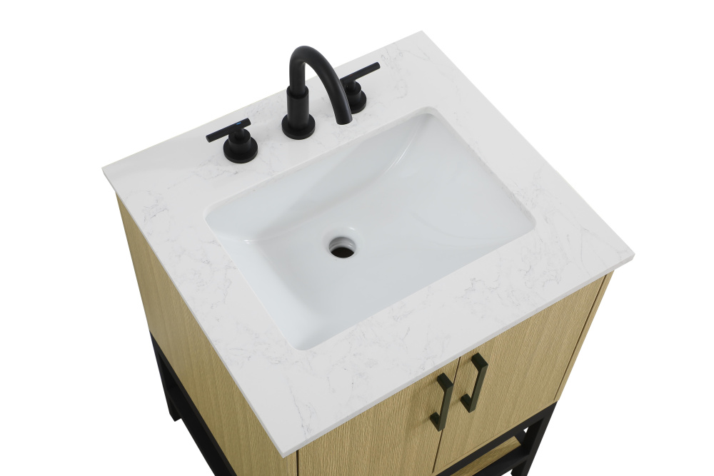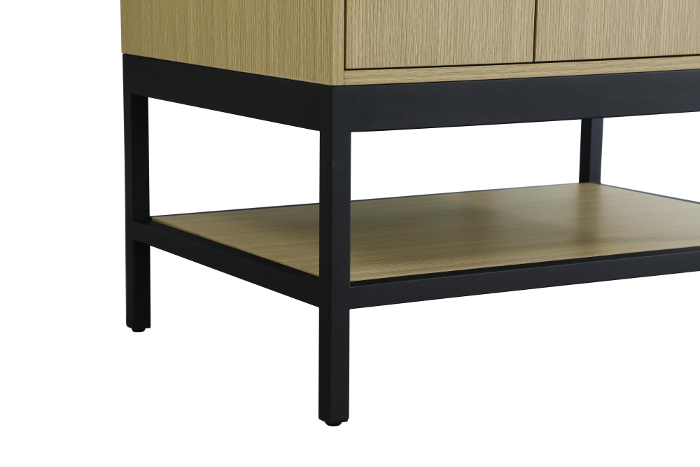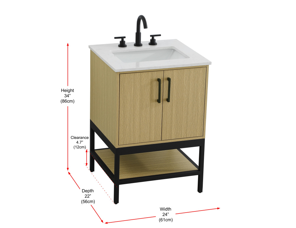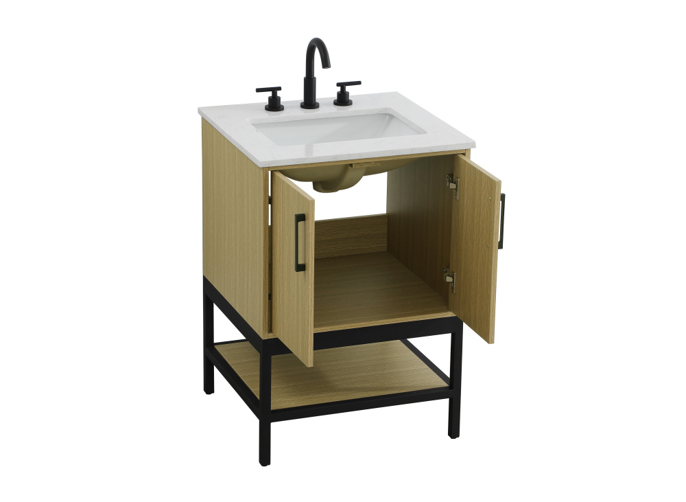 Upgrade your bathroom with this modern bathroom vanity that combines form and function effortlessly. Its sleek wood veneer cabinetry, paired with a bold black metal frame, brings a clean, contemporary vibe to any space. Designed with practicality in mind, the cabinet organizes your essentials, as well as an open lower shelf for added storage or display. The durable engineered marble countertop is built to withstand daily use, while the undermount porcelain sink ensures easy maintenance. Complete with matte black hardware and pre-drilled features for effortless installation, this vanity is the perfect centerpiece to refresh your bathroom with style and efficiency.