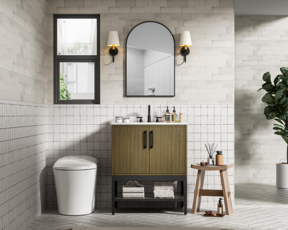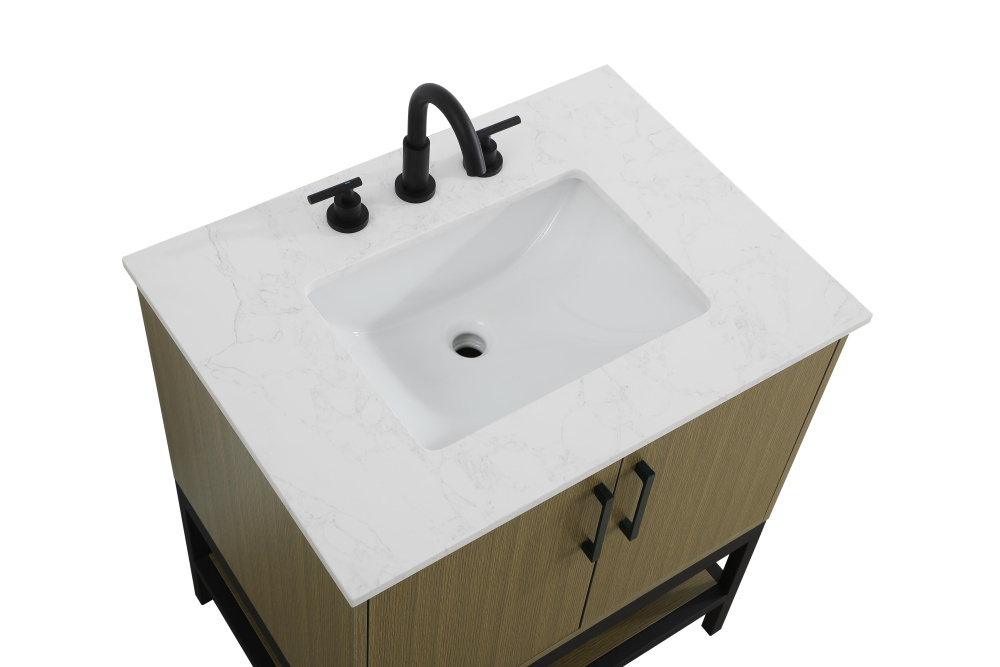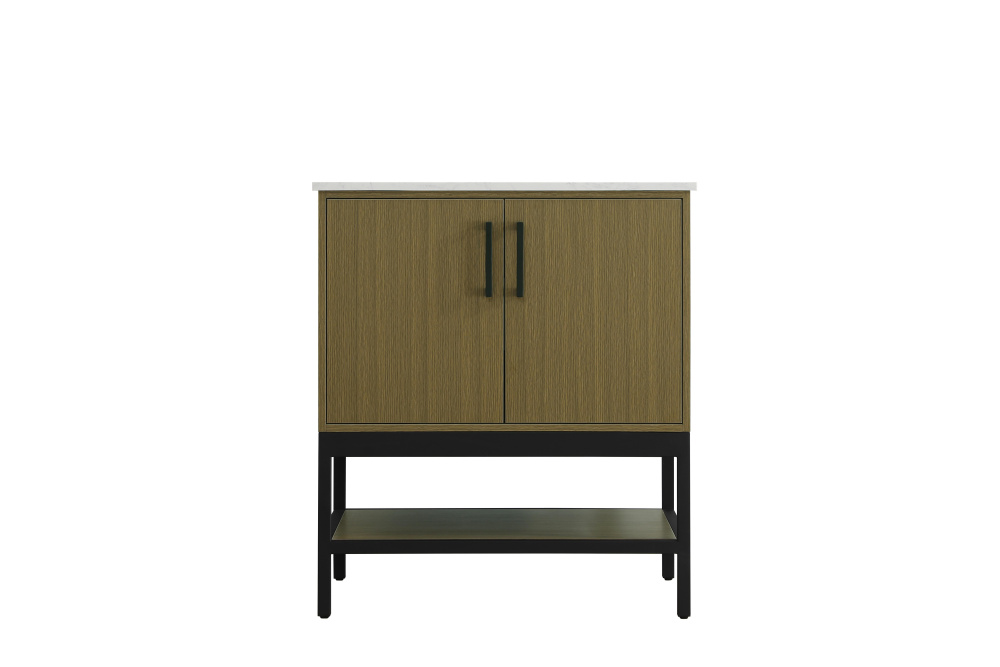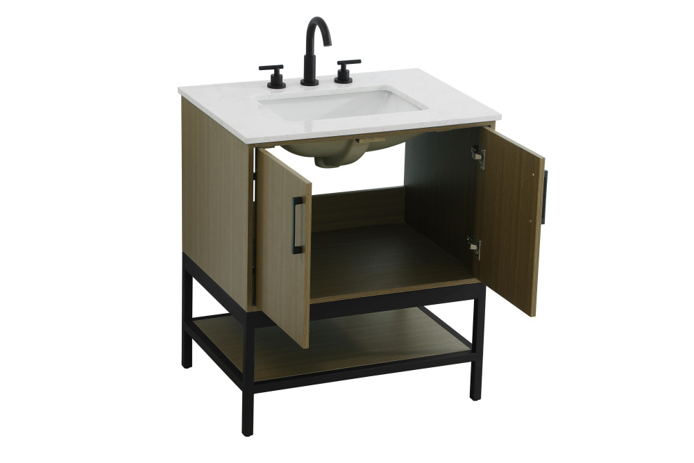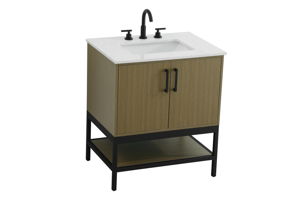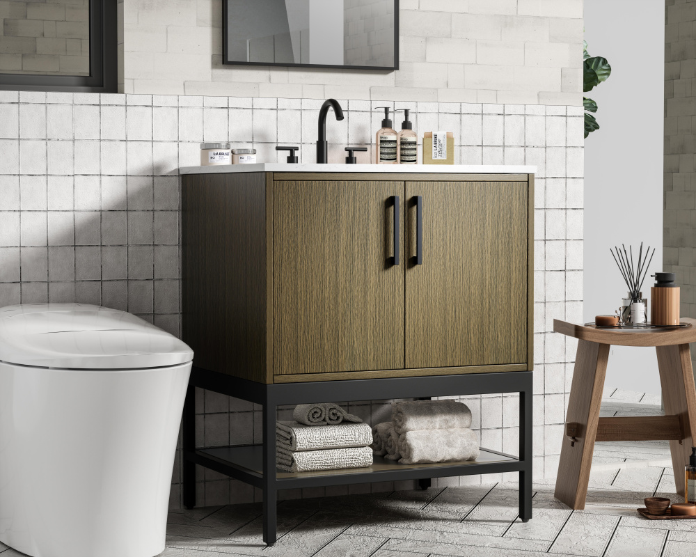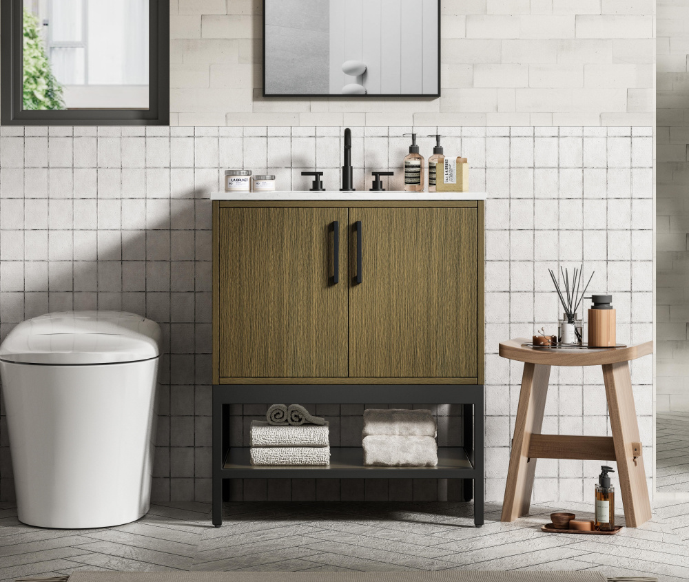 Upgrade your bathroom with this modern bathroom vanity that combines form and function effortlessly. Its sleek wood veneer cabinetry, paired with a bold black metal frame, brings a clean, contemporary vibe to any space. Designed with practicality in mind, the cabinet organizes your essentials, as well as an open lower shelf for added storage or display. The durable engineered marble countertop is built to withstand daily use, while the undermount porcelain sink ensures easy maintenance. Complete with matte black hardware and pre-drilled features for effortless installation, this vanity is the perfect centerpiece to refresh your bathroom with style and efficiency.
