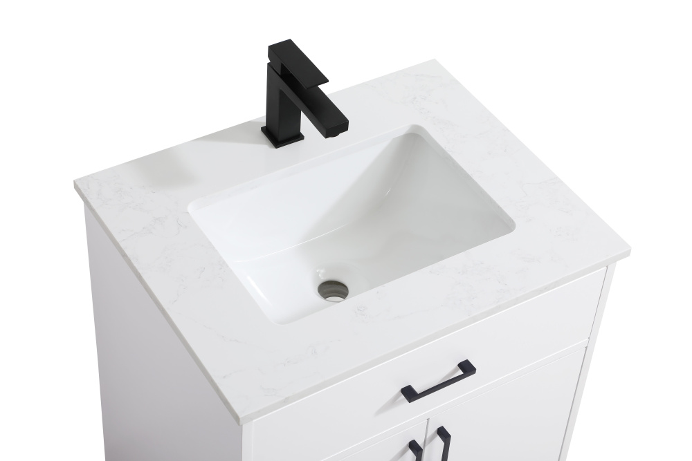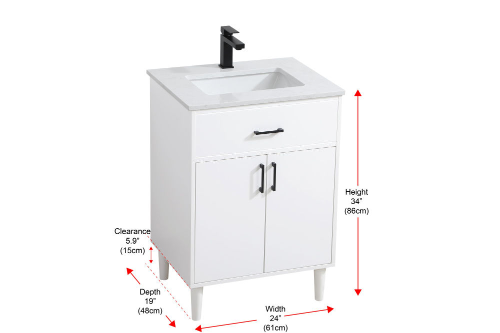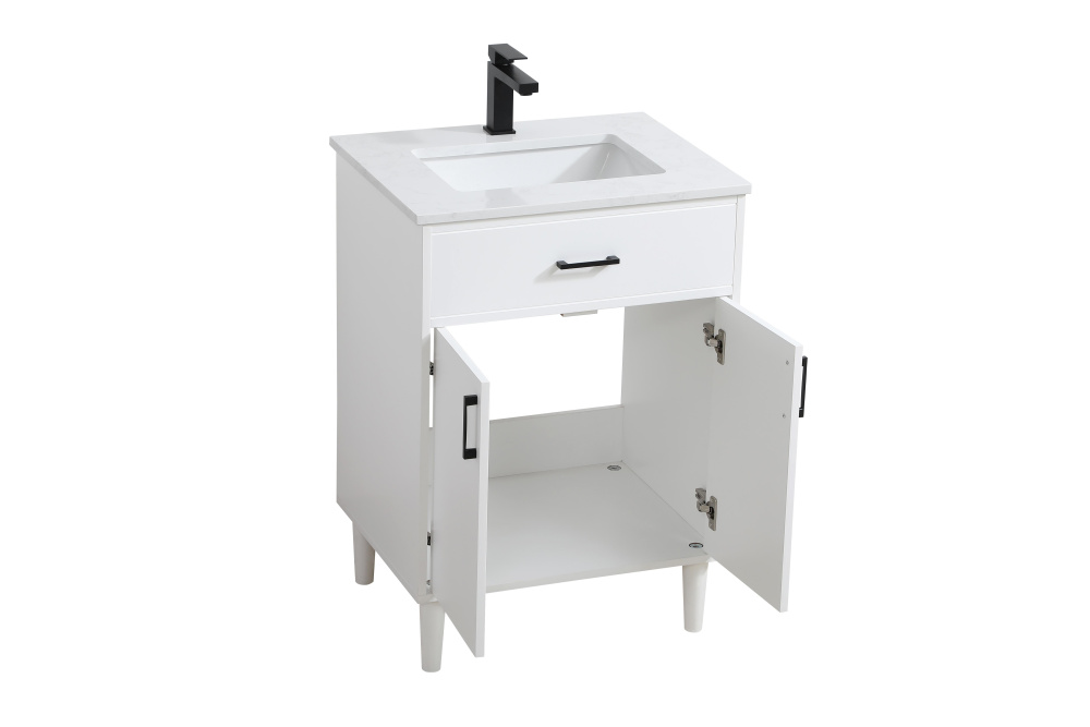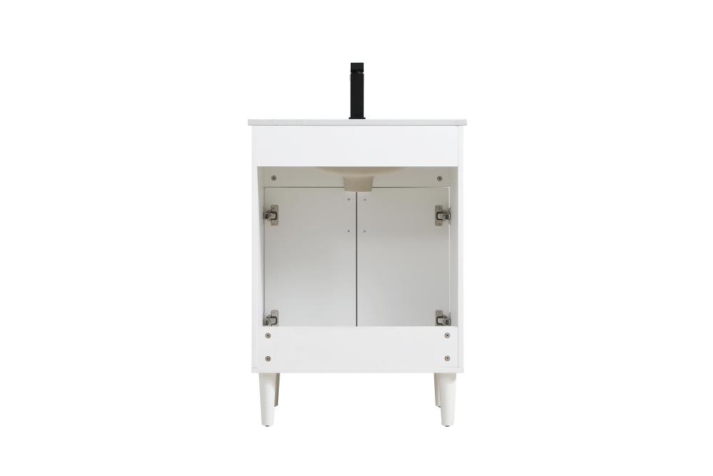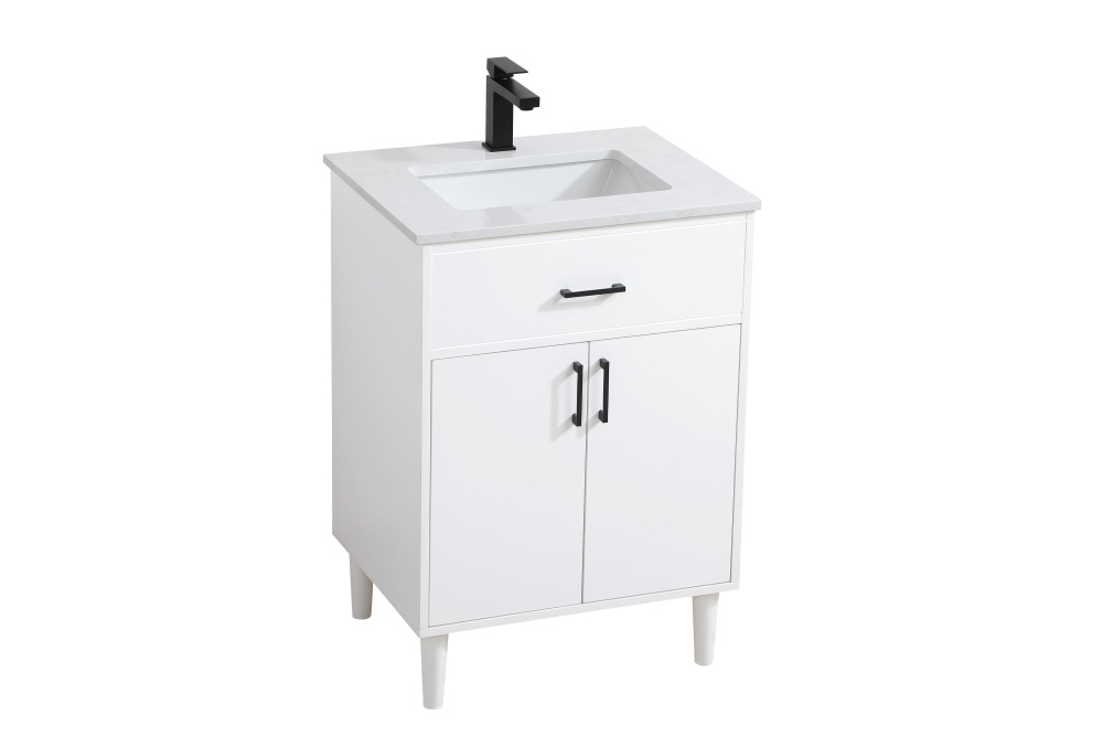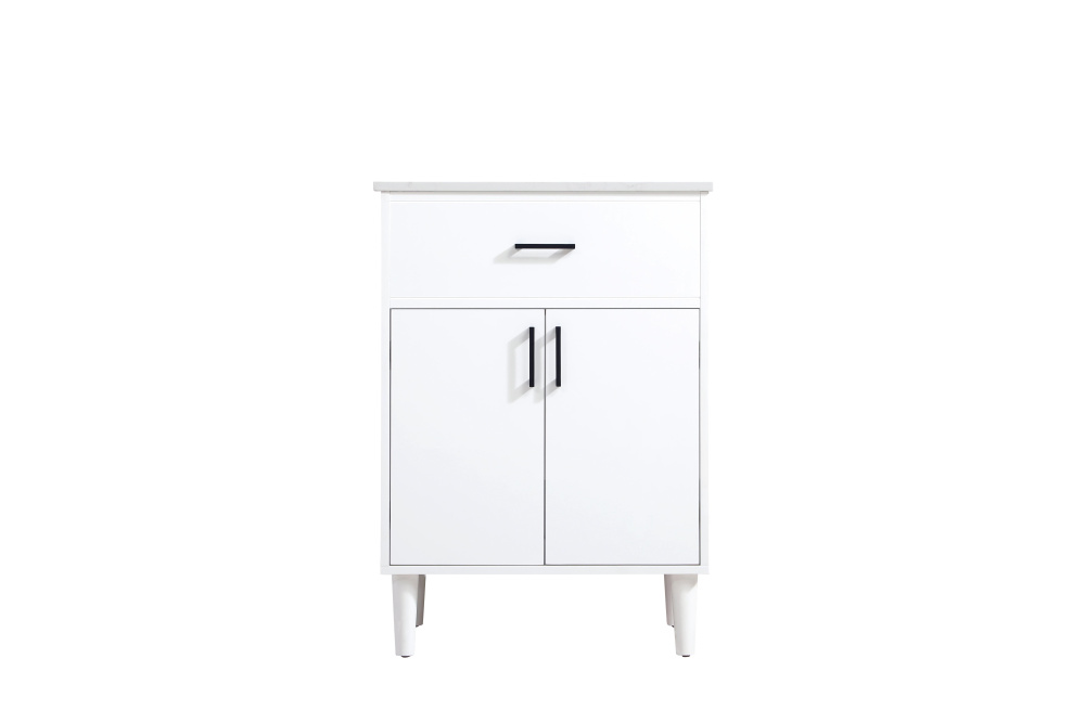 Transform your bathroom with this mid-century modern vanity, designed to bring both functionality and a sense of style to your space. Its clean lines, minimalist design, and tapered solid wood legs evoke a timeless charm, perfect for blending with modern and transitional interiors. The engineered marble countertop, with its unique faux marble veining, adds a refined, luxurious touch, while the porcelain sink is both durable and easy to maintain. Practicality meets aesthetics with a faux drawer for balanced design and a spacious double-door cabinet for efficient storage. Constructed from solid wood and MDF, this vanity offers lasting durability, while adjustable foot levelers ensure stability on any floor. Shipped mostly assembled, the solid wood legs can be effortlessly twisted into place, making installation quick and hassle-free.