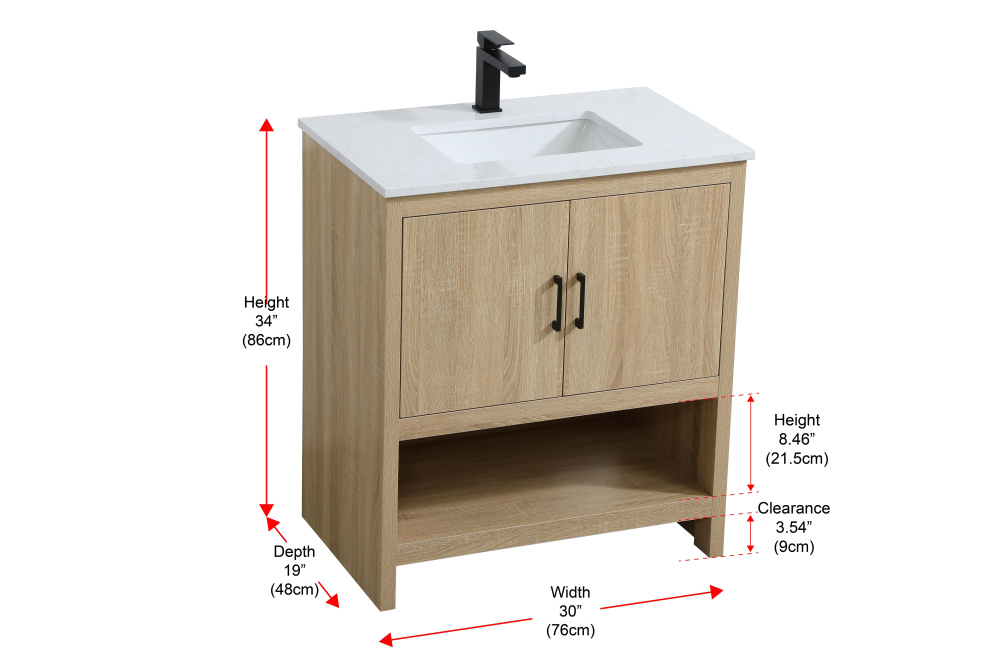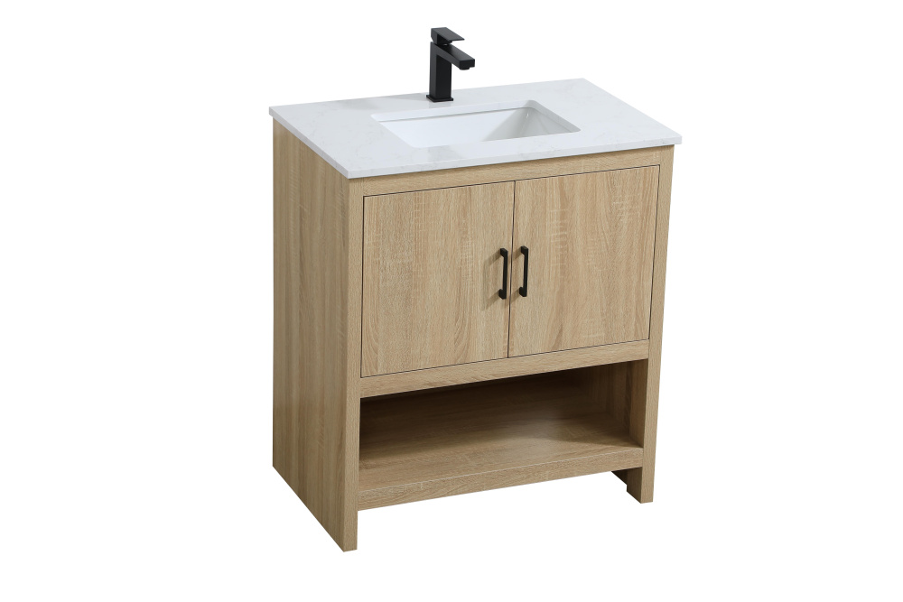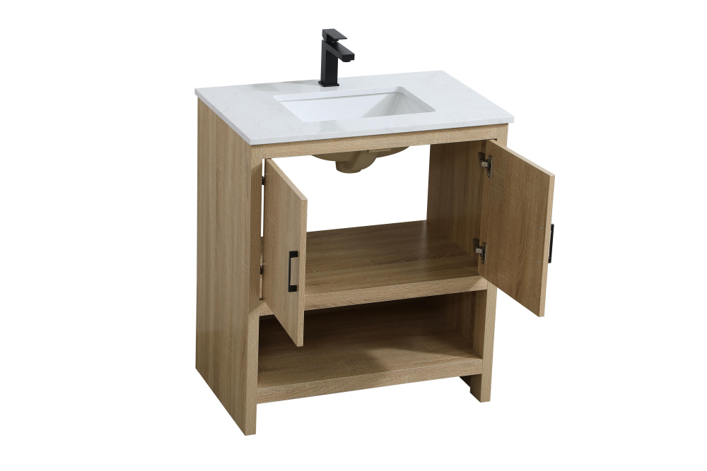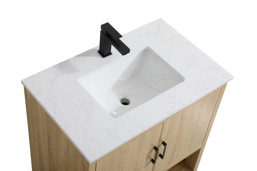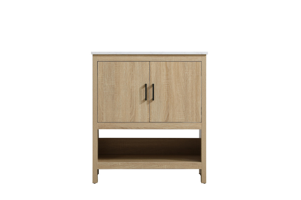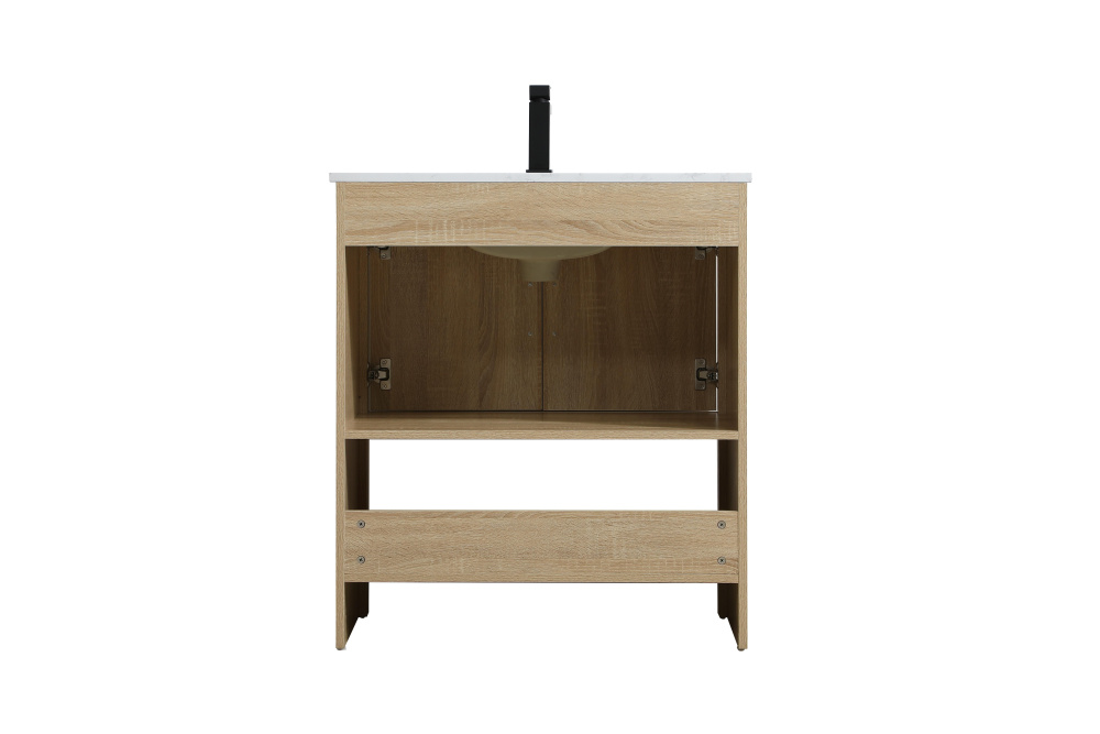 Bring modern style and practicality to your bathroom with this sleek vanity, designed to complement contemporary spaces. The flat-panel doors create a clean, minimalist look, while the open bottom shelf provides functional storage or a space to display decorative items. The engineered marble countertop showcases unique faux marbling, adding a refined and distinct touch to the design. The durable porcelain sink is easy to maintain, and the single pre-drilled faucet hole simplifies the installation process. Constructed from high-quality MDF with a versatile woodgrain finish, this vanity combines durability with timeless style. With adjustable foot levelers for stability on uneven floors and a fully assembled design, this piece offers a seamless addition to your bathroom.