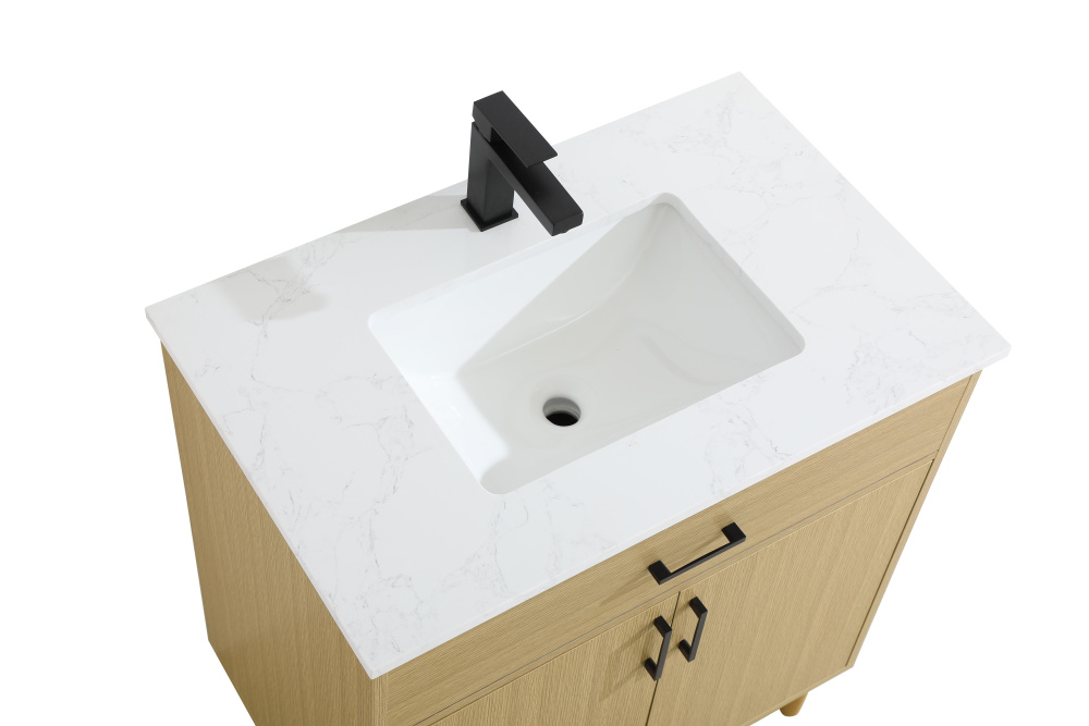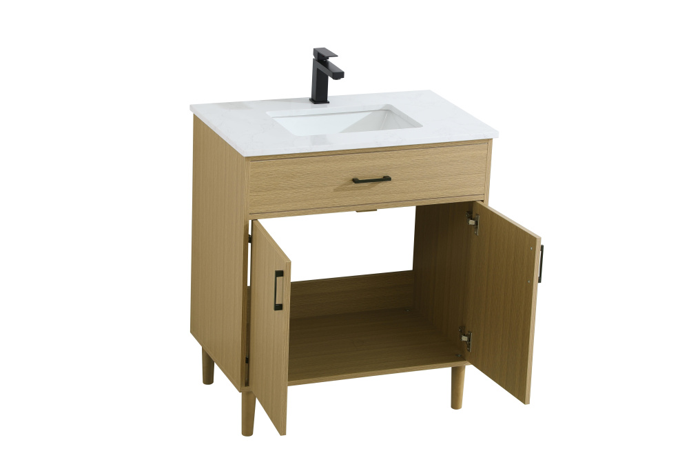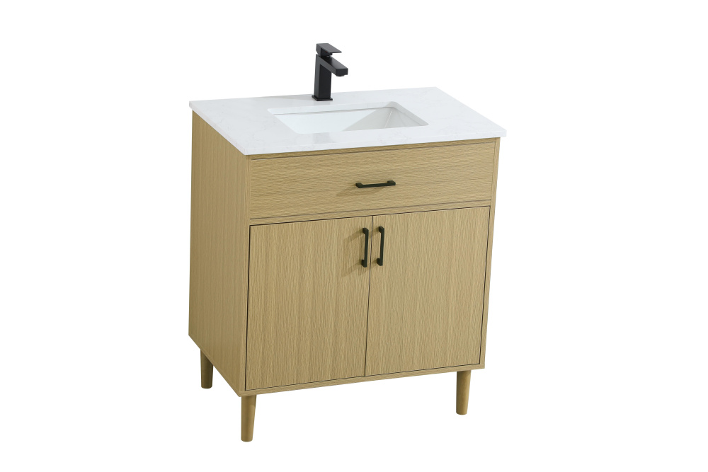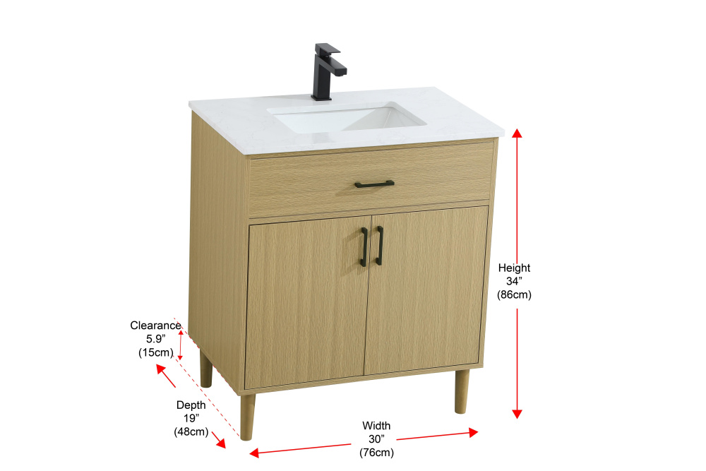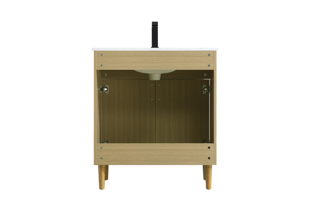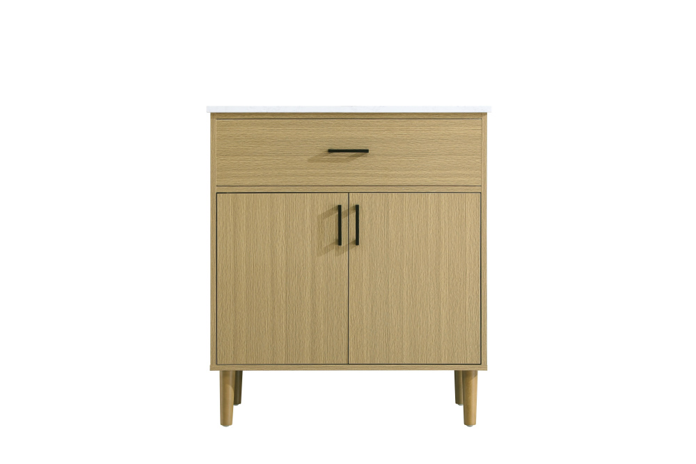 Transform your bathroom with this mid-century modern vanity, designed to bring both functionality and a sense of style to your space. Its clean lines, minimalist design, and tapered solid wood legs evoke a timeless charm, perfect for blending with modern and transitional interiors. The engineered marble countertop, with its unique faux marble veining, adds a refined, luxurious touch, while the porcelain sink is both durable and easy to maintain. Practicality meets aesthetics with a faux drawer for balanced design and a spacious double-door cabinet for efficient storage. Constructed from solid wood and MDF, this vanity offers lasting durability, while adjustable foot levelers ensure stability on any floor. Shipped mostly assembled, the solid wood legs can be effortlessly twisted into place, making installation quick and hassle-free.