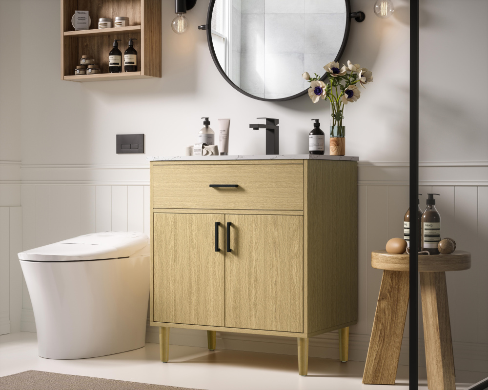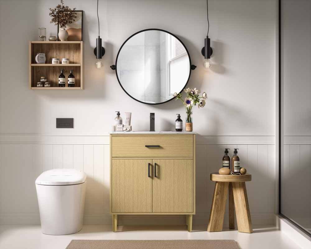 A natural wood-inspired finish adds warmth and texture to your bathroom.