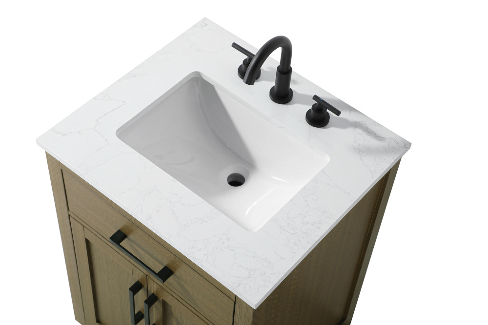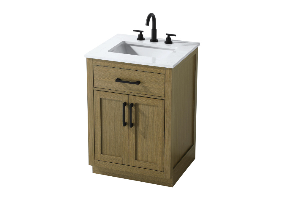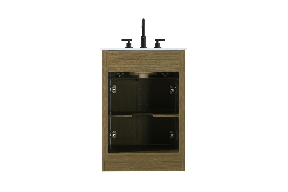 Introduce a perfect balance of functionality and style to your bathroom with this thoughtfully designed vanity. Constructed with a combination of solid wood and MDF, it offers durability and a sturdy build. The sleek engineered marble countertop with subtle grey marbling complements the rustic wood grain finish, creating a stylish and inviting centerpiece for your bathroom. Designed in a contemporary style with a transitional flair, it features a U-shaped shelf for seamless plumbing integration and multiple soft-close drawers for clutter-free organization. A pull-down drawer enhances convenience, while the toe kick adds a refined, clean-lined appearance and simplifies cleaning underneath. Matte black hardware contrasts beautifully with the cabinet finish, tying the look together. Delivered fully assembled and equipped with foot levelers, this vanity combines practicality and aesthetic appeal to suit modern and transitional bathrooms alike.